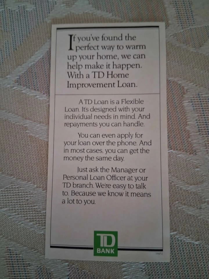 Buy & SellVintage 1969 TD Home Improvement Loans FlyerVintage 1969 TD Home Improvement Loans Flyer$7Available for pickup in Mississauga. Cash onlyWHERE TO MEETBud Gregory Boulevard & Gatineau AvenueView MapSELLERRobert EHurontario717 reviews0 chats·0 favorites·4 viewsSEND CHAT TO SELLERHi Robert E! I’m interested in your listing.Hi Robert E! I’m interested in your listing.Get the Karrot app to chatSign In to chat