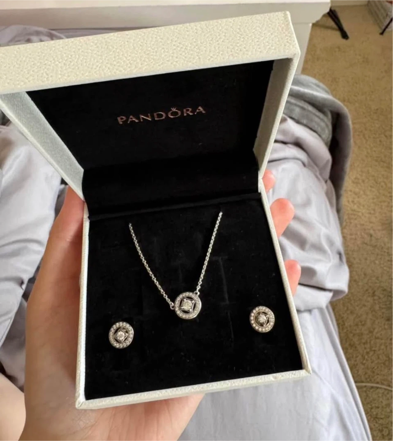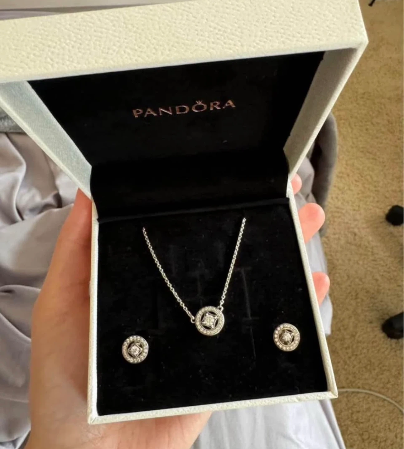 A lovely Pandora necklace and matching stud earrings. This set comes in its original Pandora box. It's made with sterling silver and accented with sparkly stones. Brand new is $350 asking for $160! never worn before (not my style)