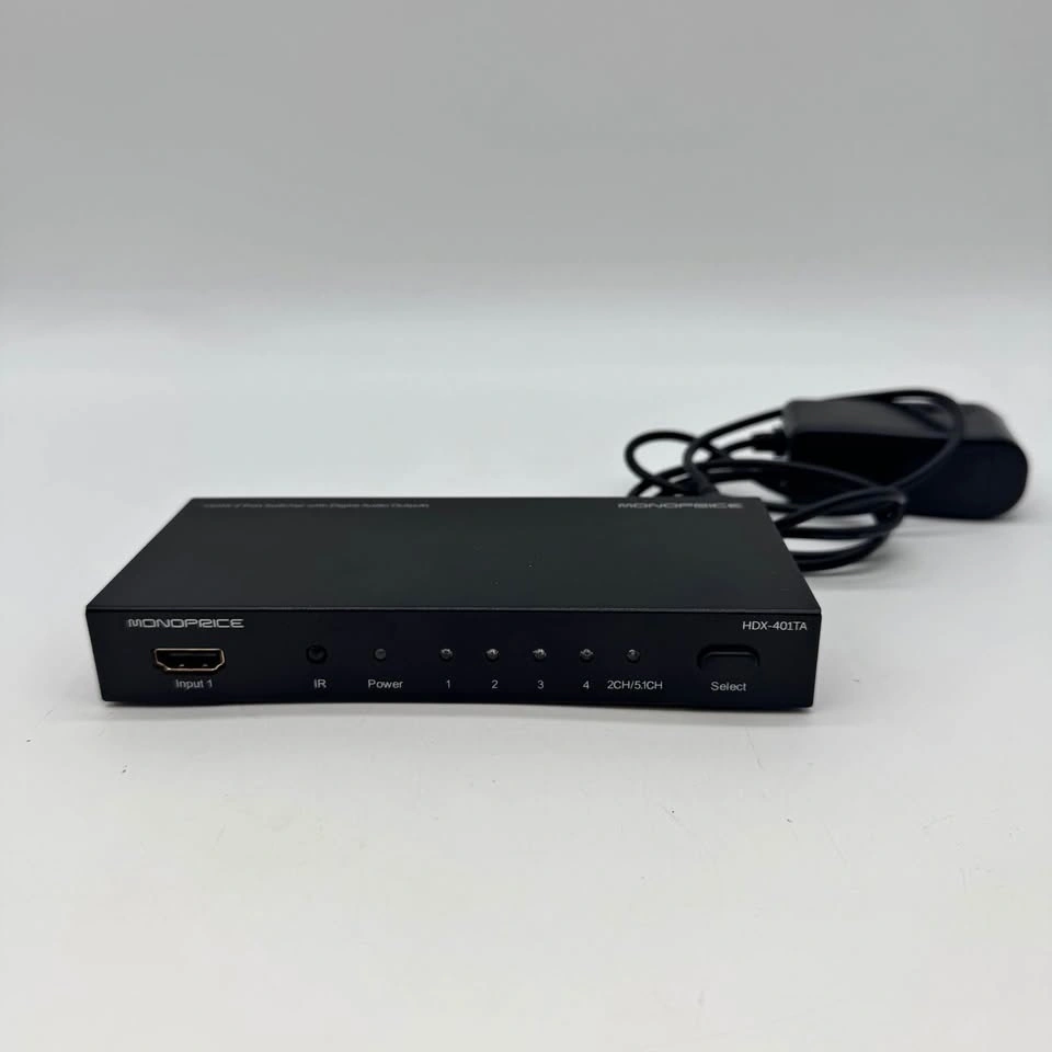 Tested and working Monoprice 4-port HDMI switcher. Great for connecting multiple devices (PS5/Xbox/Apple TV/Blu-ray, etc.) to one TV or monitor. It also has built-in digital audio outputs for sound systems.