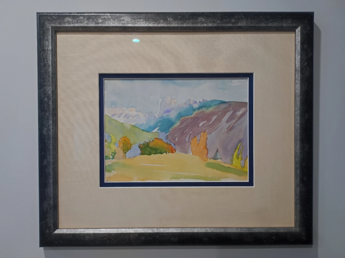 A lovely framed watercolour painting by late Italian artist Wilfried Senoner depicting a vibrant Dolomites mountains landscape. It features rolling hills, colourful trees, and distant peaks under a soft sky. This piece would brighten any wall!