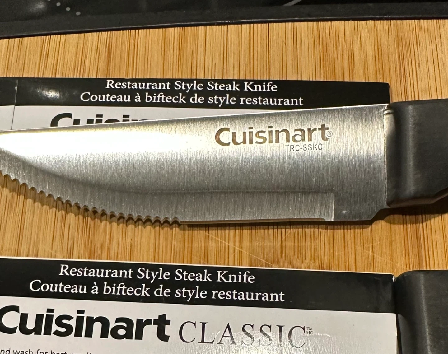 $20-Brand new set of 6 Cuisinart Classic steak knives with serrated blades. They're restaurant style and made for easy cutting. They have full tang construction with triple rivets for durability.
