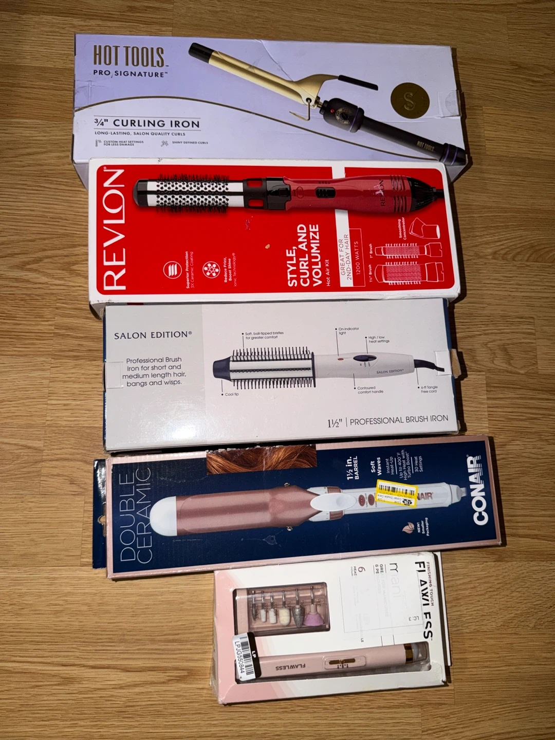 Variety of hair styling tools including a curling iron, brush iron, and stylers. Brands include Hot Tools, Revlon, Conair, Salon Edition, and Flawless. Some tools are new in box.