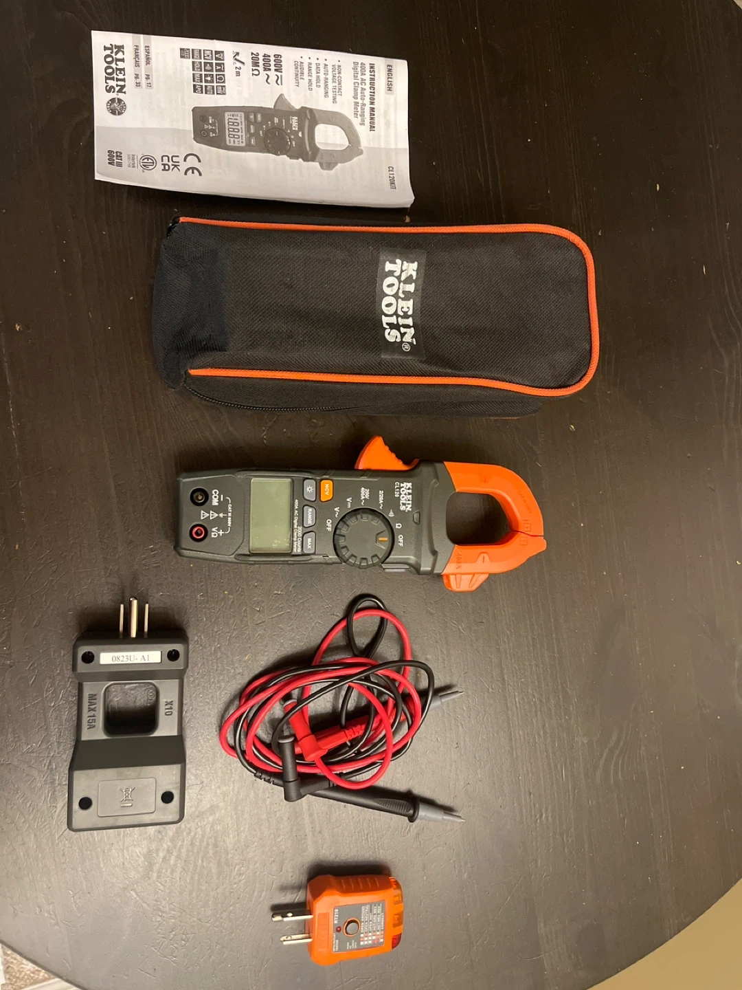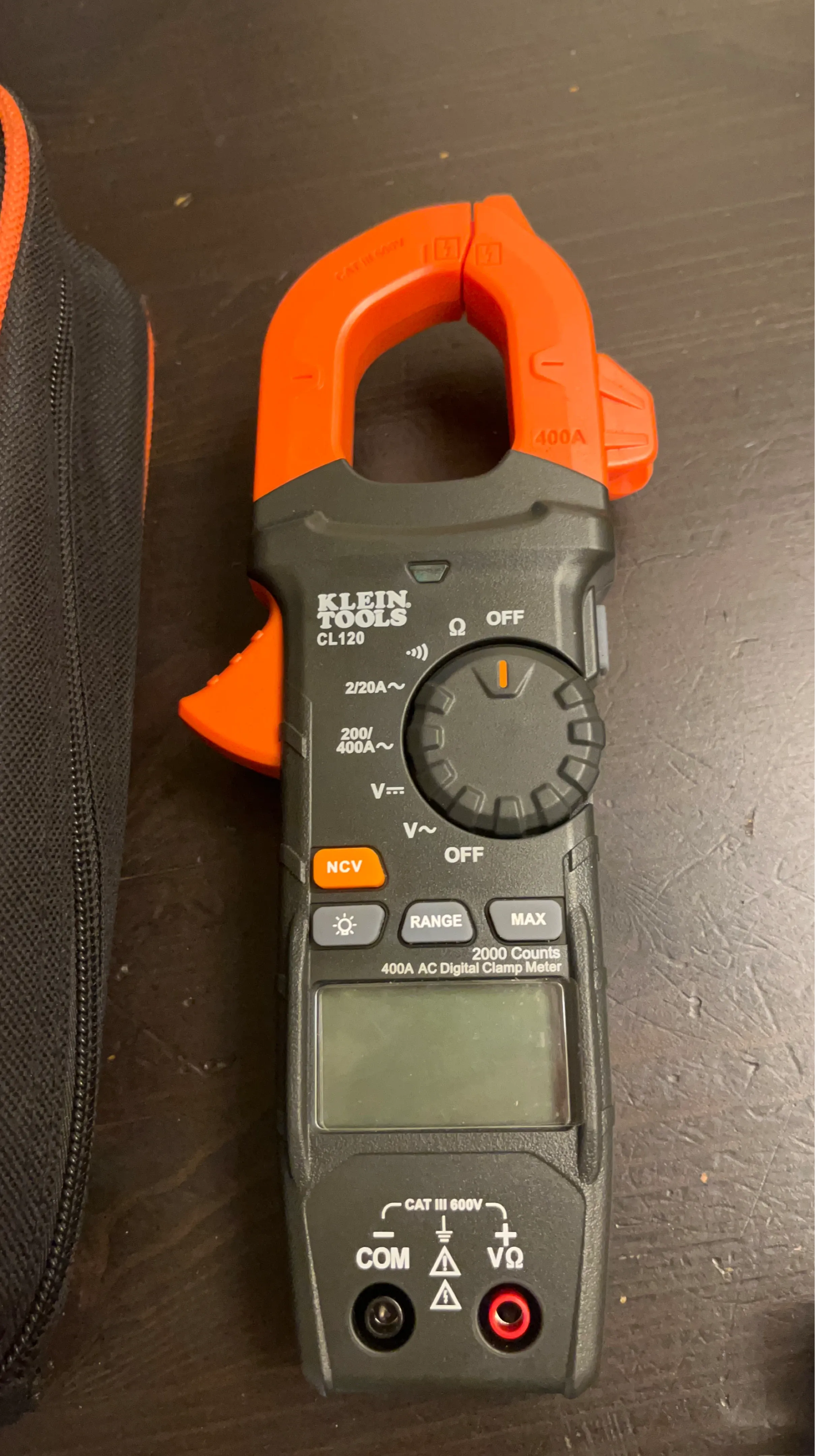 This is a Klein Tools CL120 400A AC Digital Clamp Meter. It includes the meter, test leads, carrying pouch, and manual. It's rated CAT III 600V.