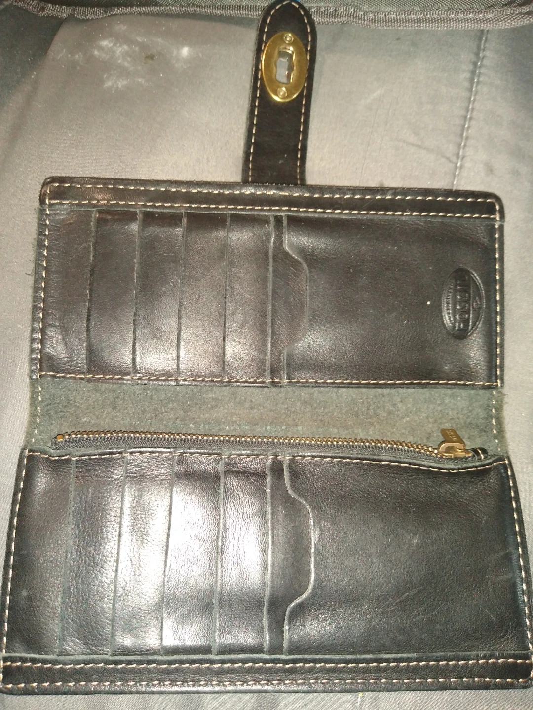 This is a really fashion forward leather wallet it's by fossil it's got a nice conservative print on the leather it's brand new not used has no rips or tears or scratches on it it's really just really cool and the pattern is hip but hip and Chic but also sophisticated. Anybody would really love this wallet it just makes you feel good when you go to unbutton it and use it at all.