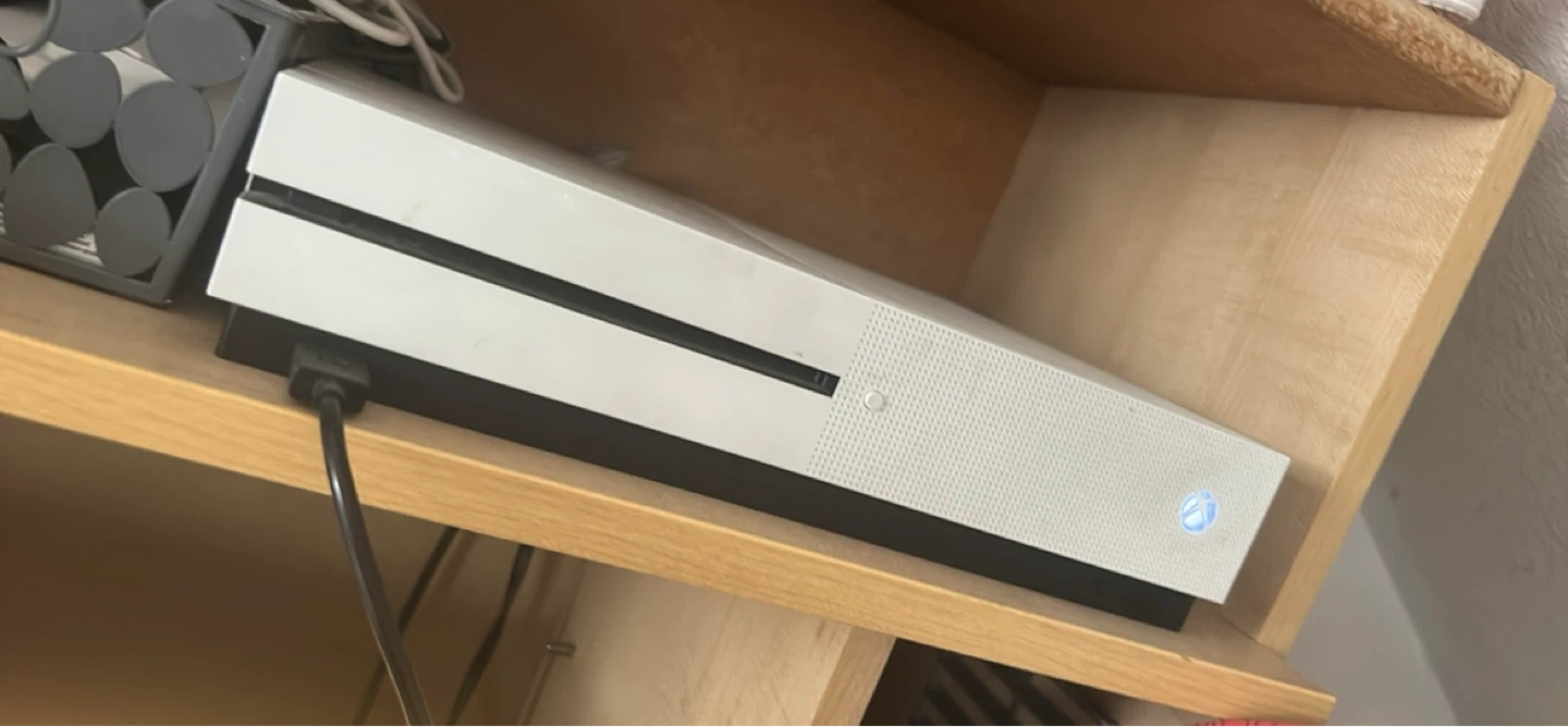 This is a white Xbox One S console. It's a slim model that's great for gaming. It includes the console and power cable, HDMI, controller.