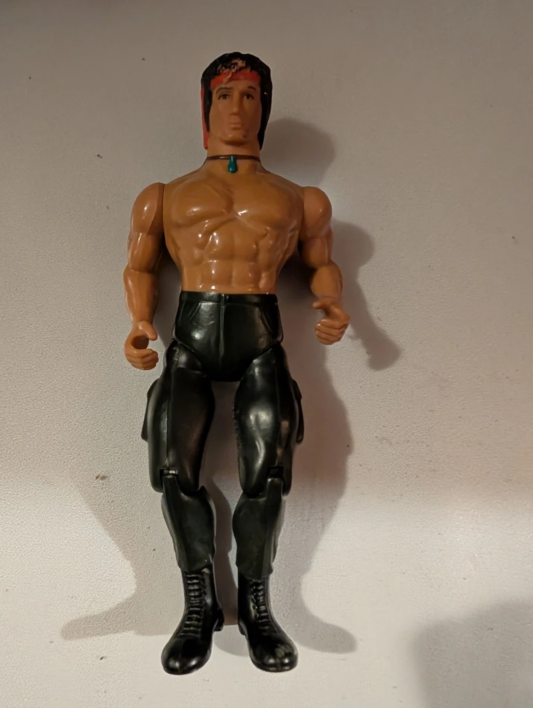 This is a vintage action figure, styled after John Rambo. It's made of hard plastic with articulated limbs. The figure wears black pants and boots, with a red bandana and a turquoise necklace. A great collectible for fans!
