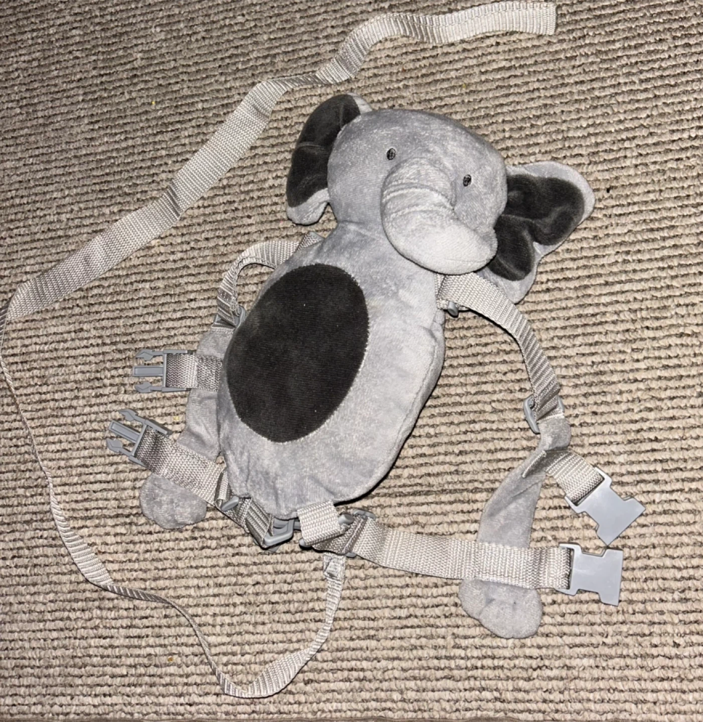 Safety first! Soft plush elephant backpack designed for toddlers. It's grey with a darker grey circular patch on the front. Includes adjustable straps and a detachable tail tether for safety. This harness backpack helps keep little ones close and safe while out and about!