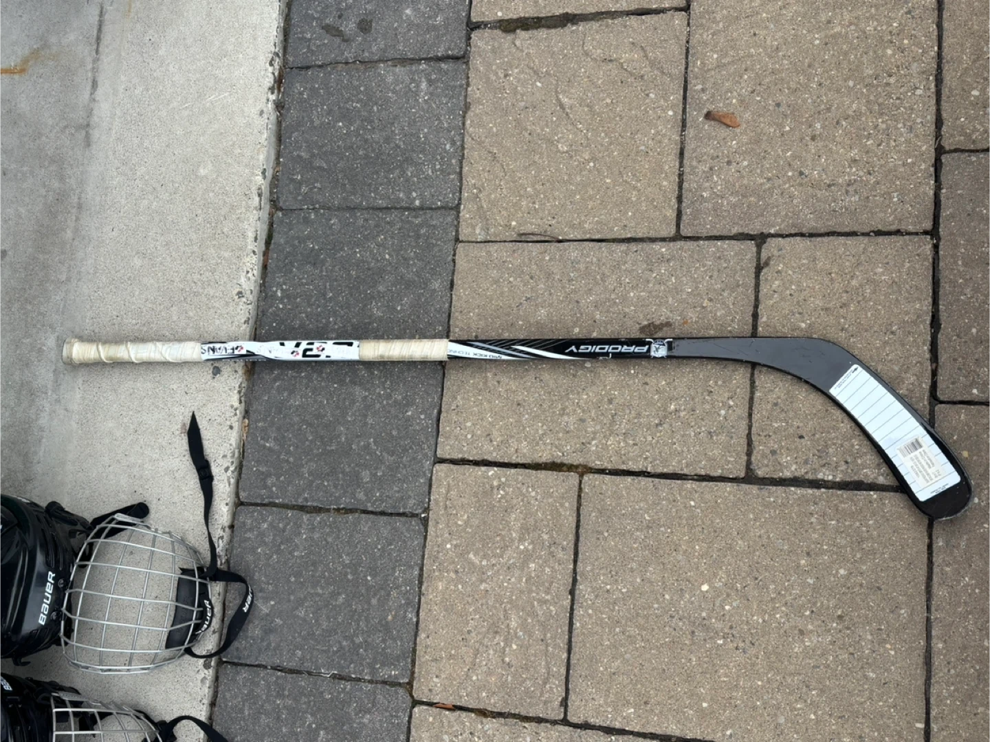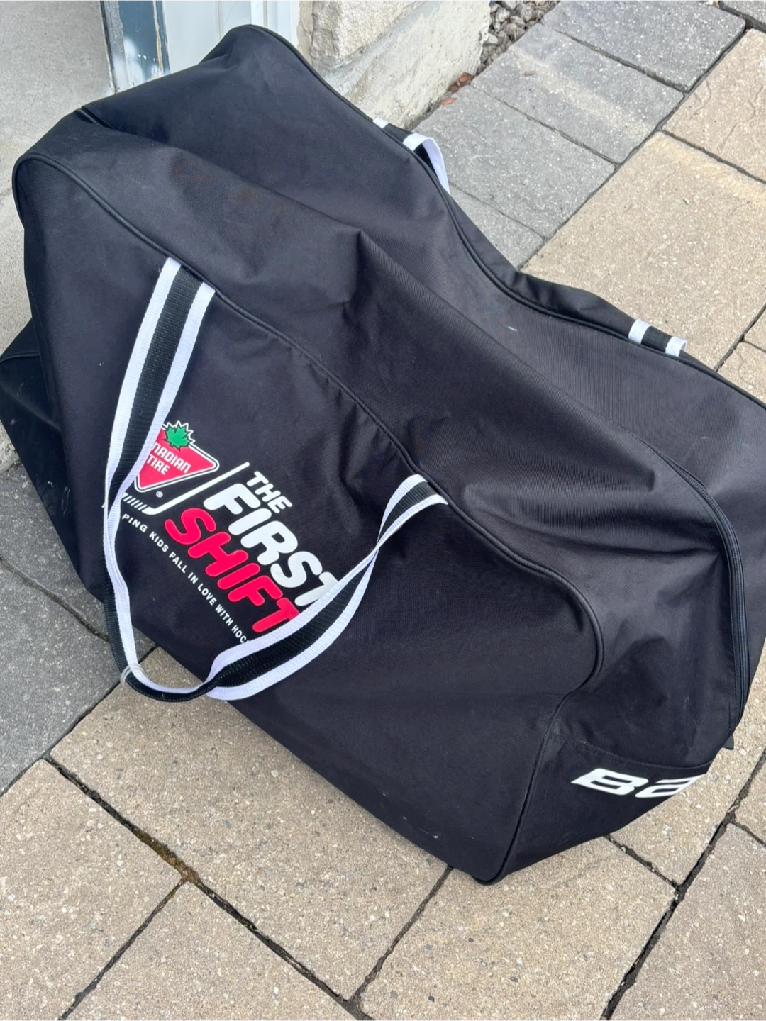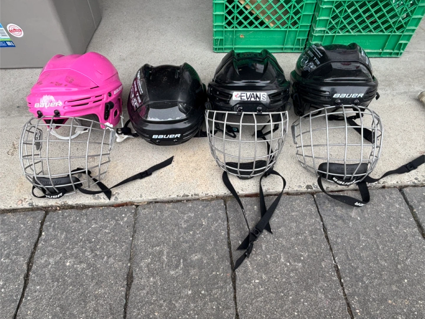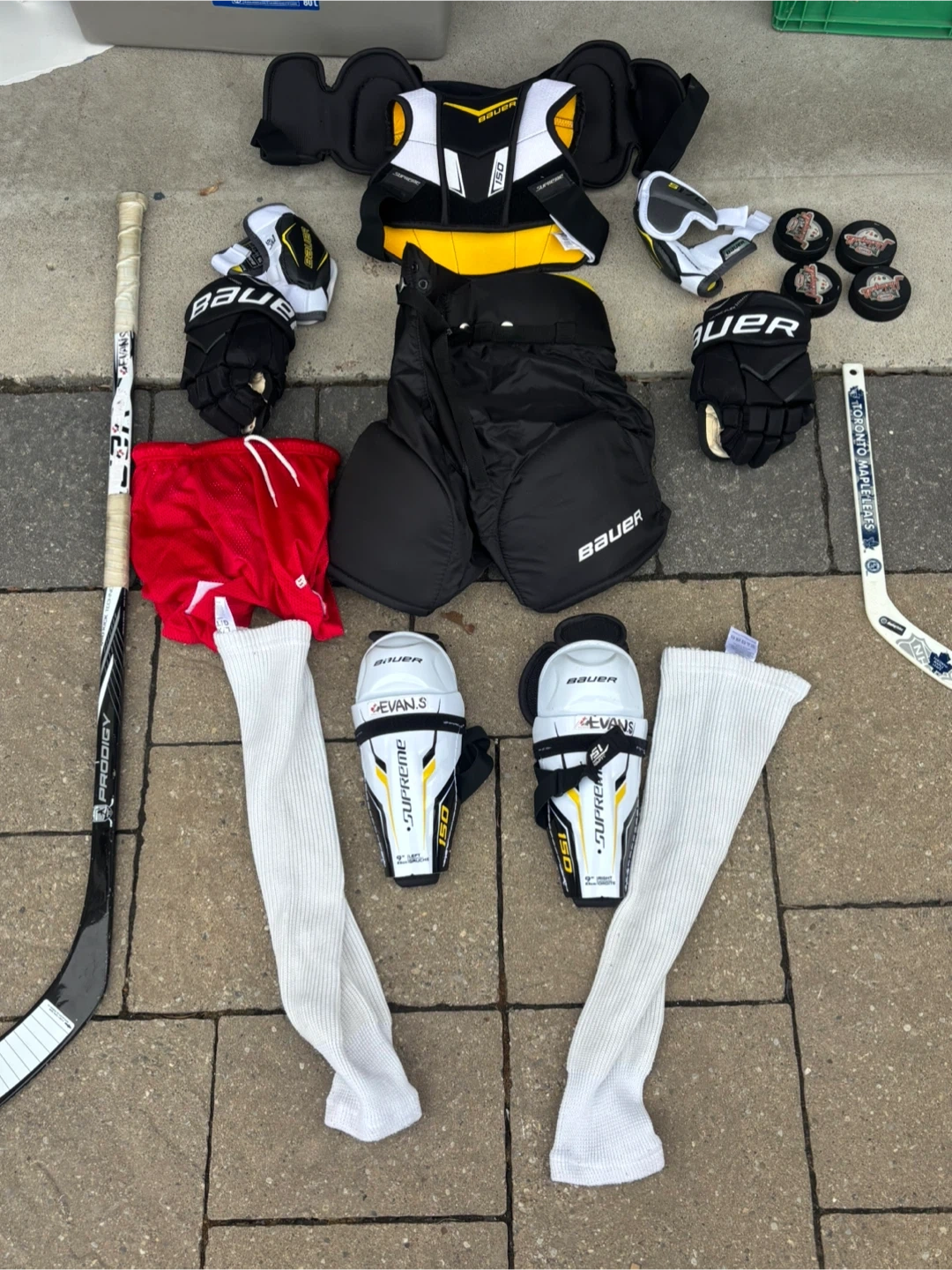Four Bauer hockey helmets and a hockey stick are included. There's also a black hockey bag with "The First Shift" branding. Protective gear like shin guards, elbow pads, gloves, and a chest protector are also part of this set. It looks like there are also two hockey socks and a pair of red hockey pants. This collection is great for 6-11 years olds!