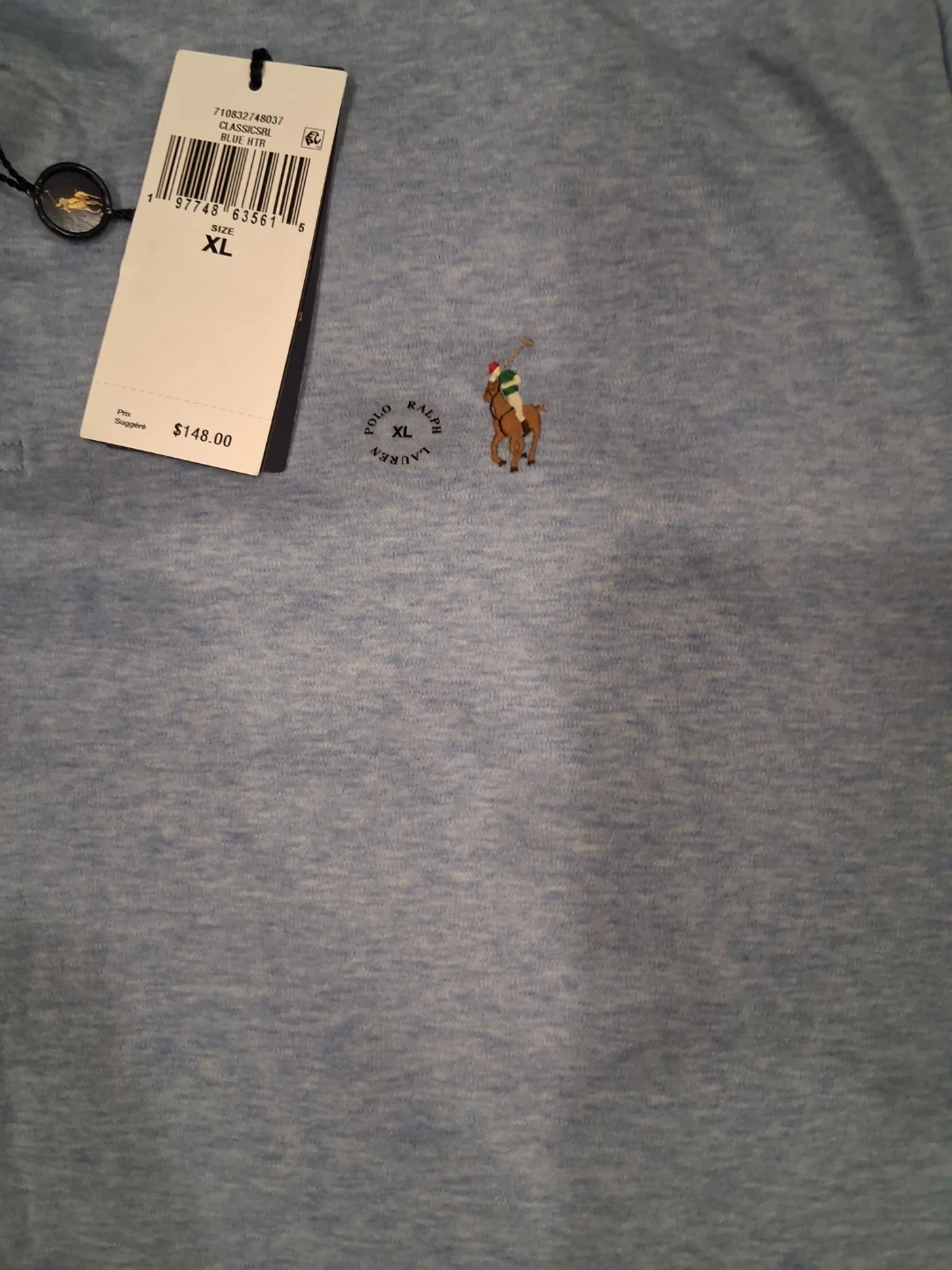 This is a light blue Polo Ralph Lauren classic fit polo shirt. It's size XL and features the iconic polo player logo. Original price was $148.00. + tax brand new with tag selling 75$