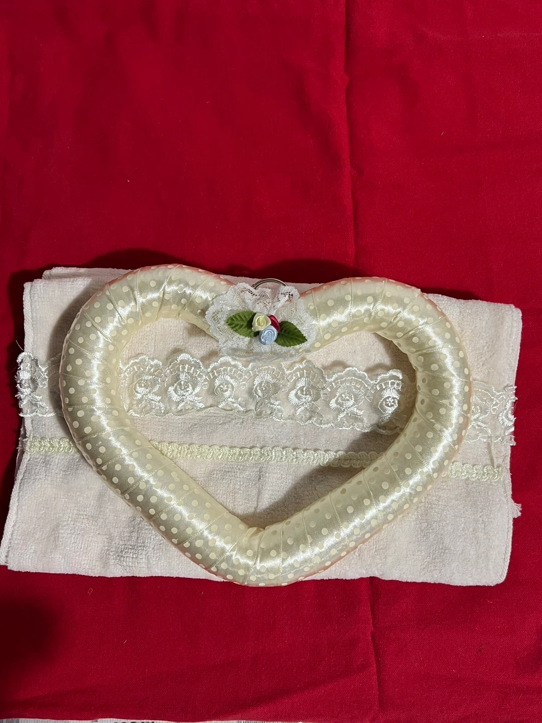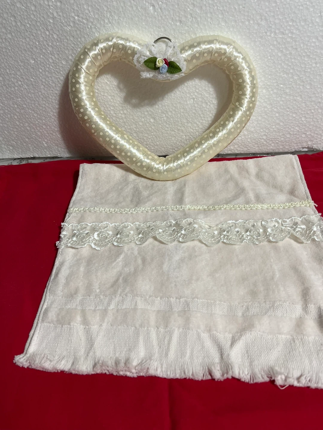 A lovely decorative towel with delicate lace trim, paired with a charming heart-shaped decoration. Perfect for adding a touch of warmth to your home decor