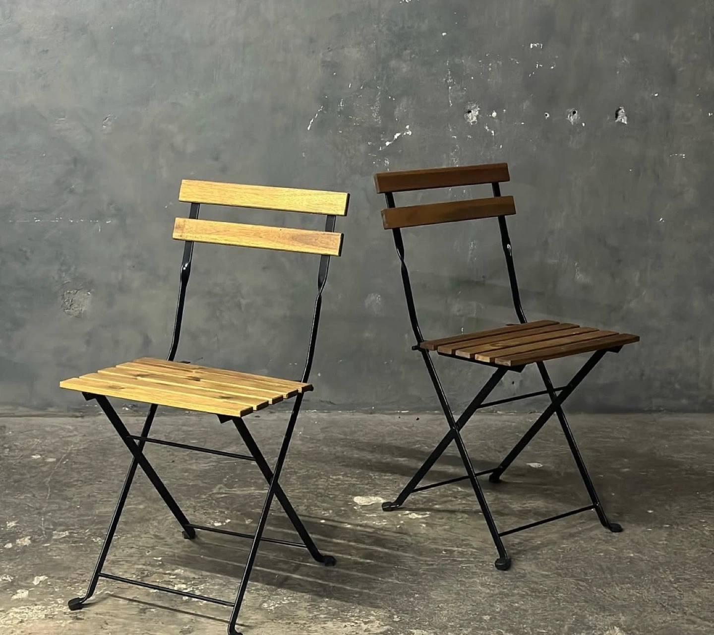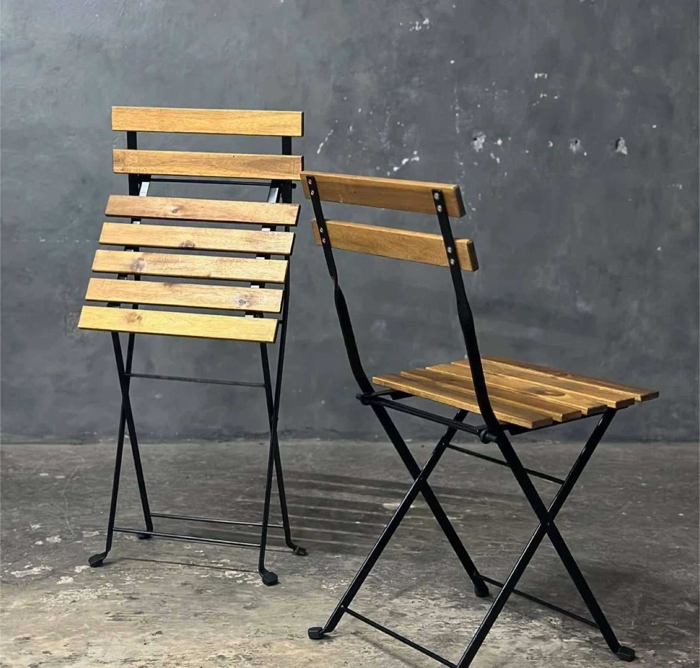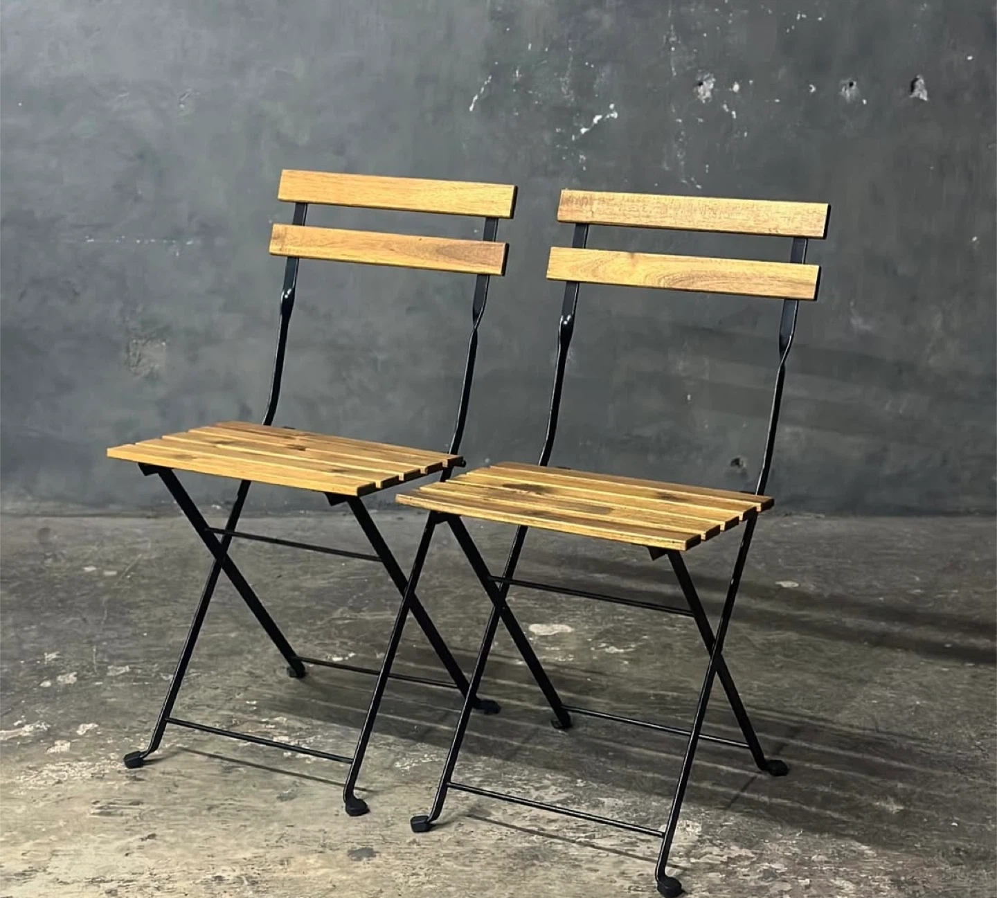 A pair of folding bistro chairs with wooden slatted seats and backs on black metal frames. They're perfect for small patios or balconies. Chairs are foldable for easy storage.