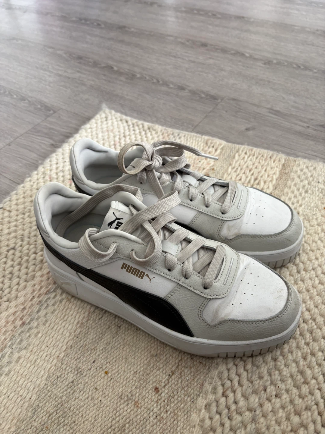 These Puma sneakers are white with grey accents and a black stripe. They have a classic lace-up closure. White rubber soles.