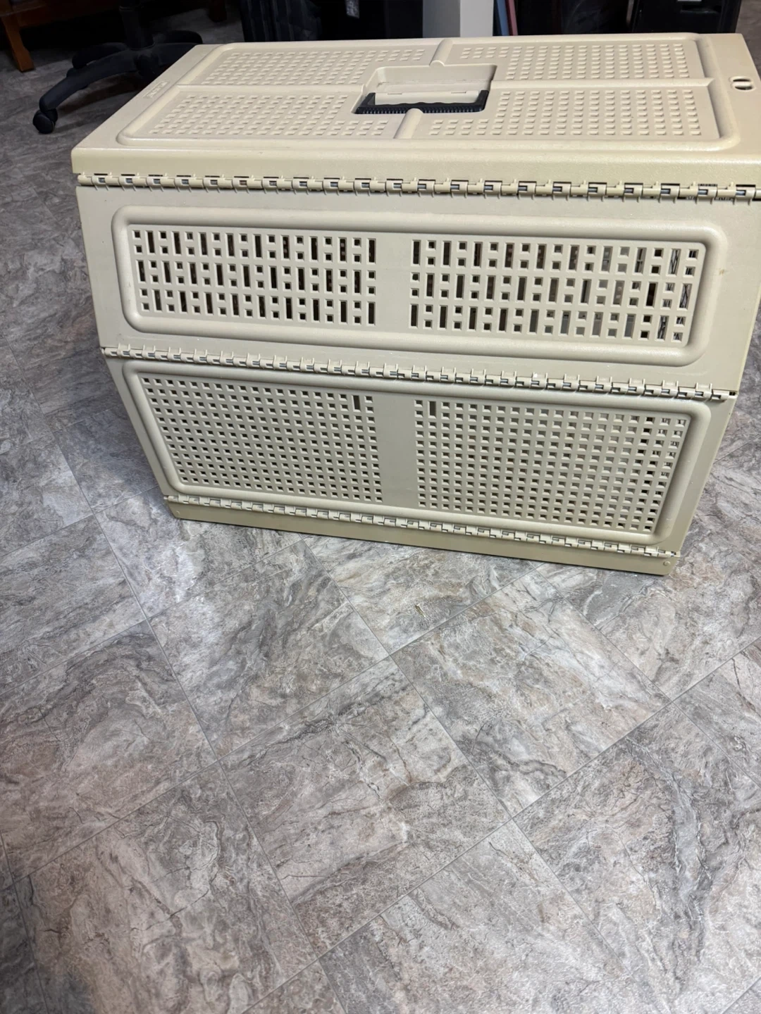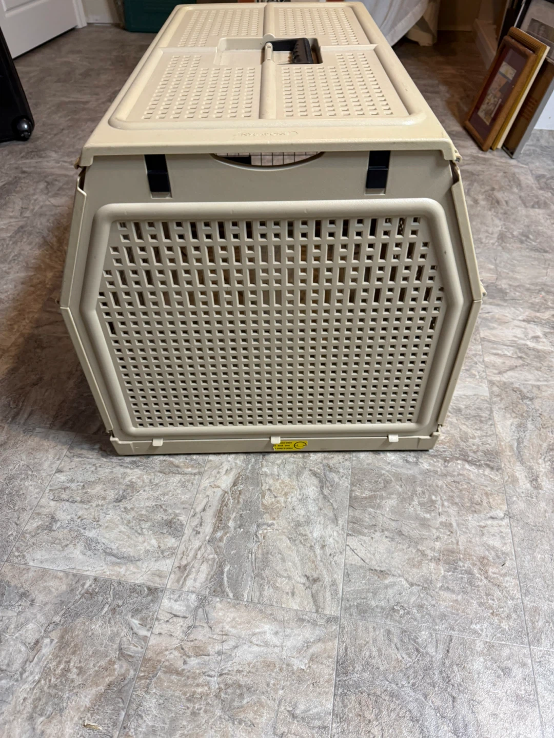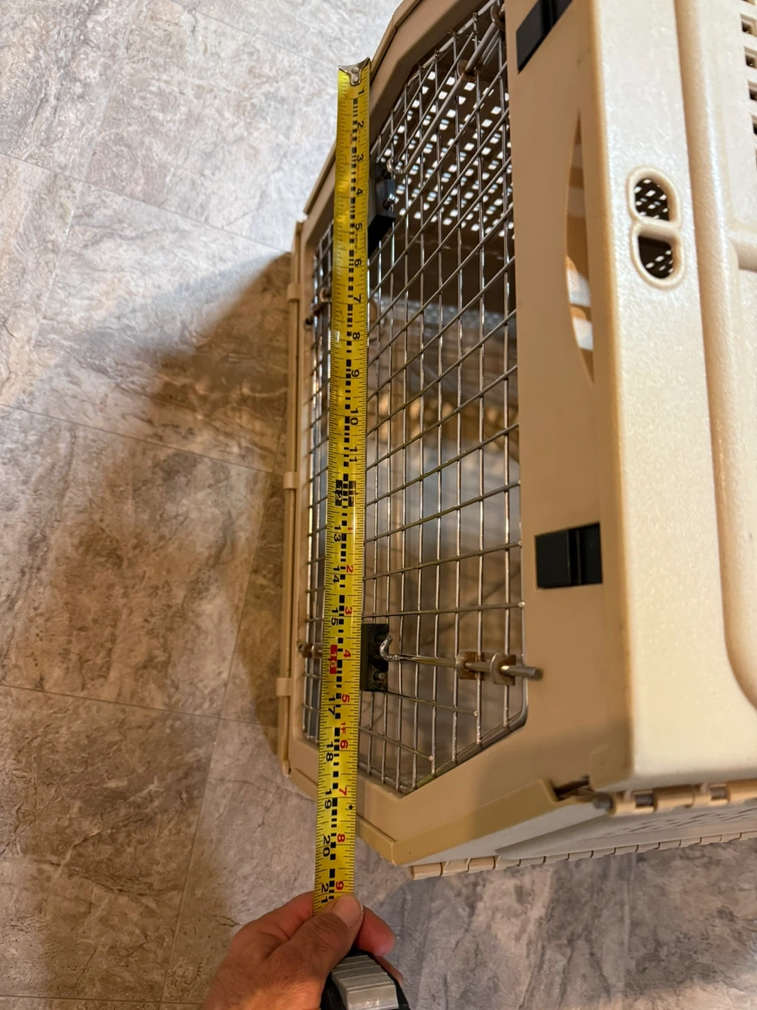 Beige plastic pet carrier for travel or home. It features a wire door and ventilation slots. Dimensions are approximately 20 inches tall. Other measurements in the pics.