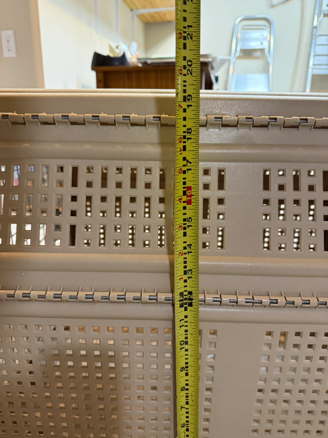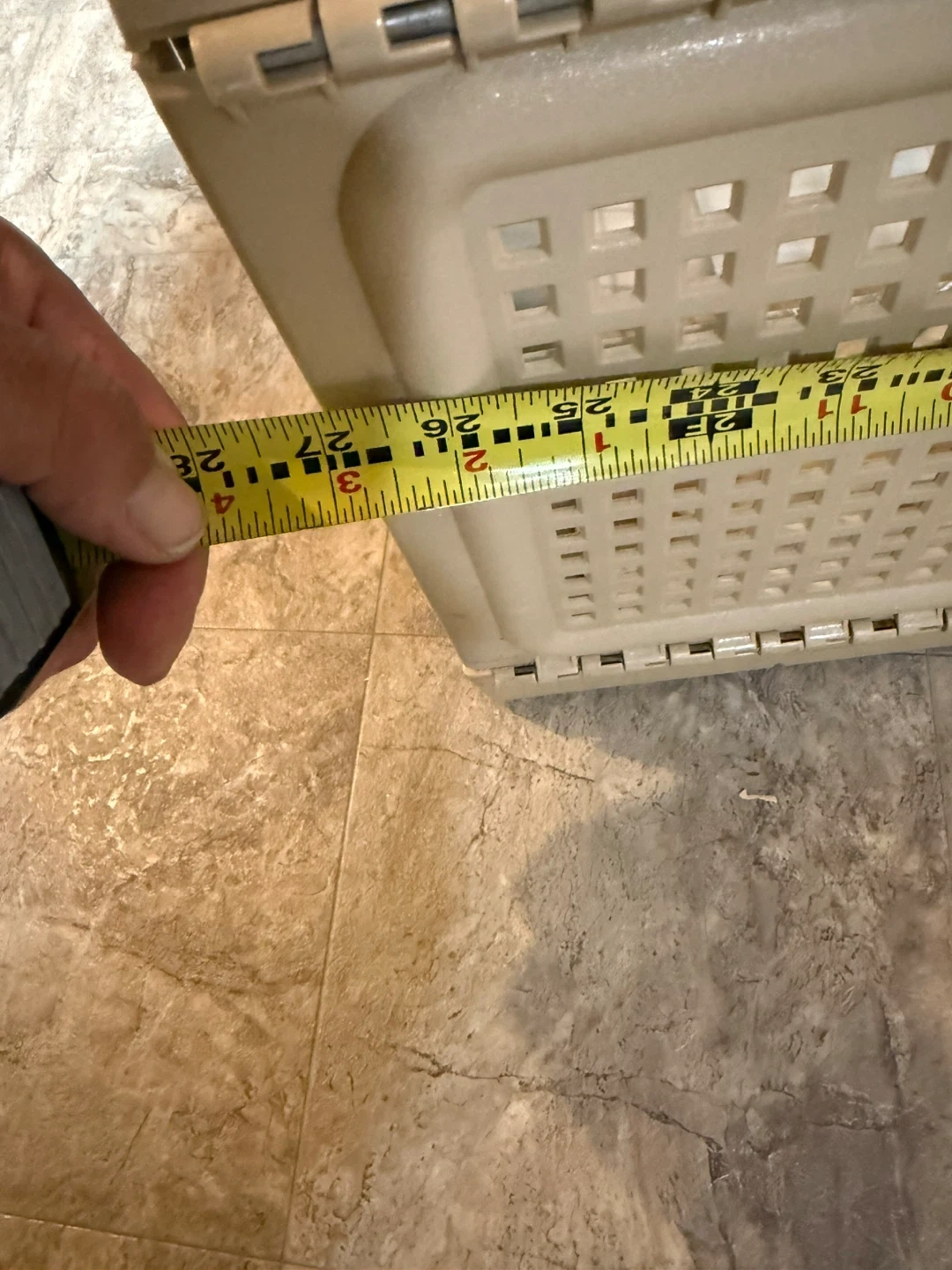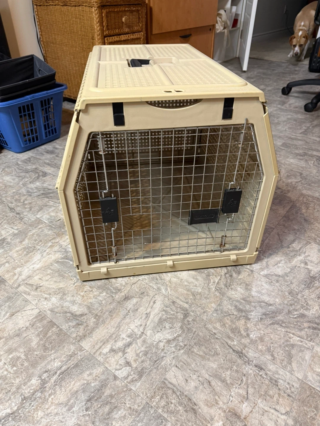 Beige plastic pet carrier for travel or home. It features a wire door and ventilation slots. Dimensions are approximately 20 inches tall. Other measurements in the pics.