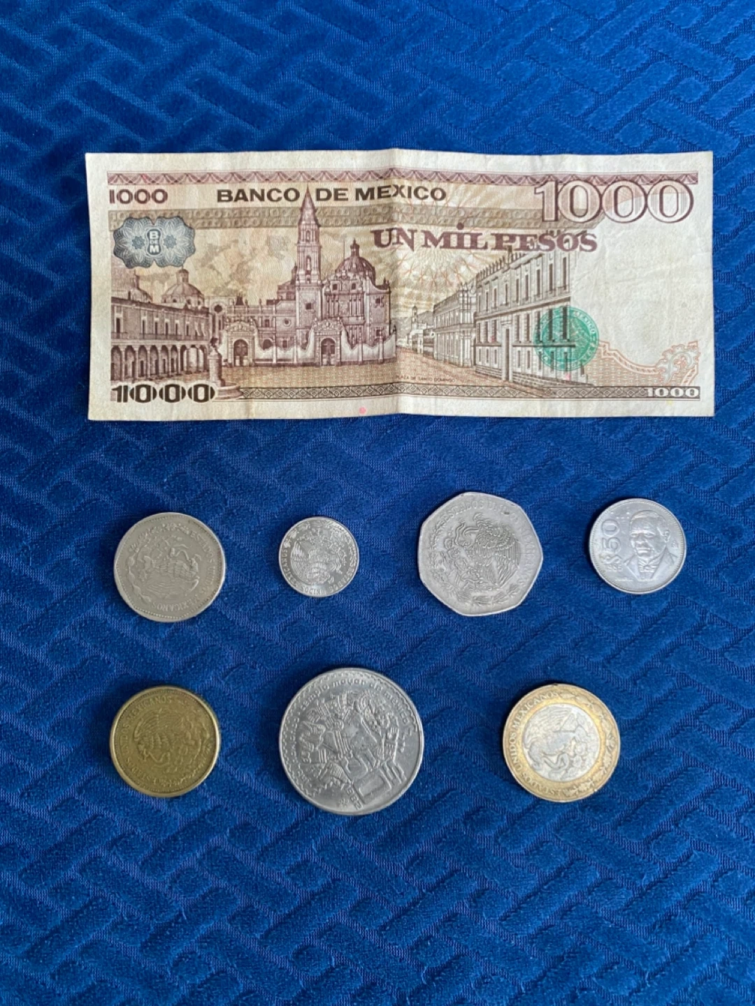 This listing features a collection of Mexican currency, including one 1000 Pesos banknote and several assorted coins. The banknote displays historical imagery from Mexico. These items are suitable for collectors interested in numismatics.