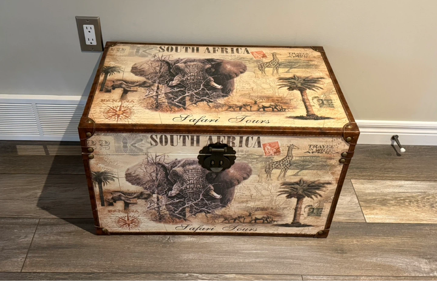 A decorative storage trunk featuring a "Safari Tours" theme with elephant and giraffe graphics. It has metal accents and a latch closure. This trunk is ideal for storing items and adding a touch of adventure to your decor.