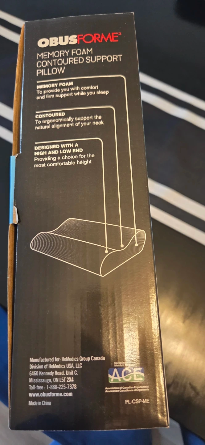 ObusForme Memory Foam Contoured Support Pillow. Engineered for the human body. Memory foam provides comfort and firm support. Ergonomically designed to support natural neck alignment.