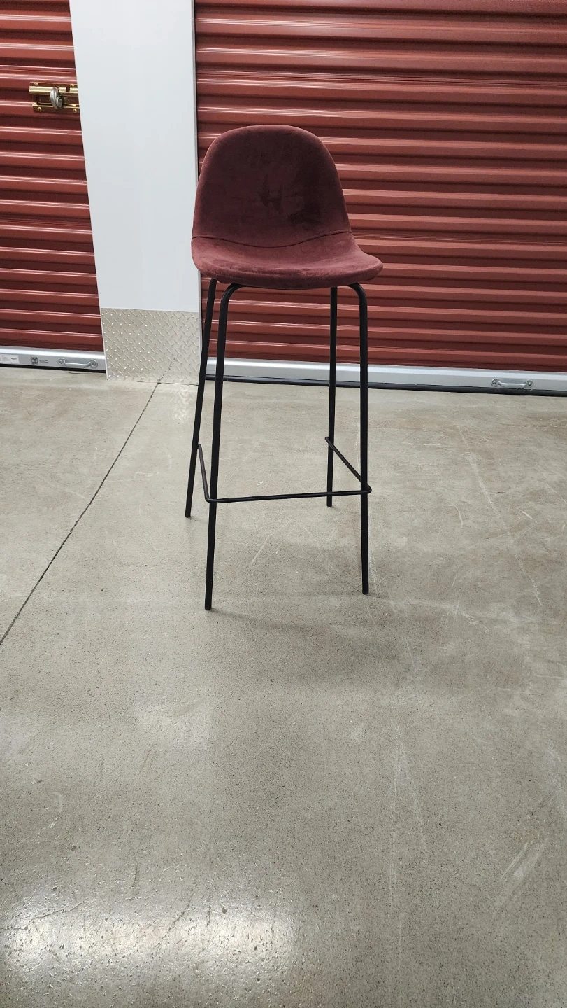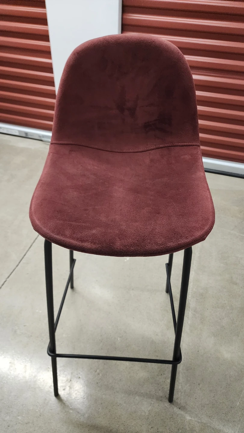 This bar stool features a comfortable, burgundy upholstered seat and a sturdy black metal frame. The fabric has a soft, suede-like texture. It's designed for a counter or bar height setting.