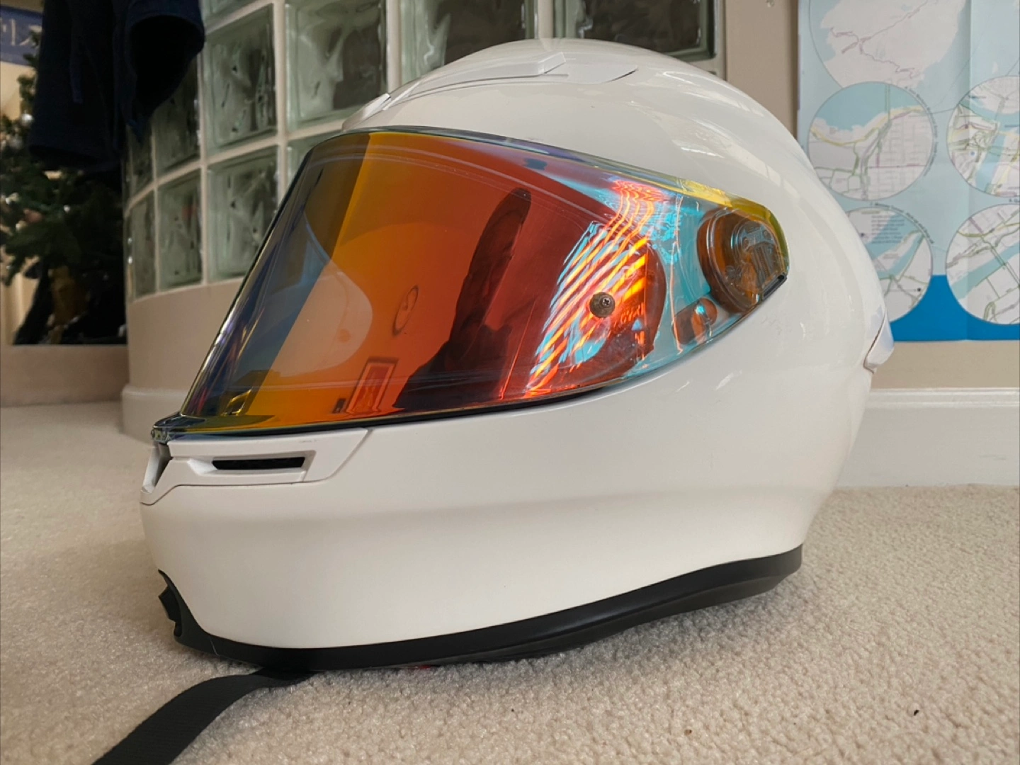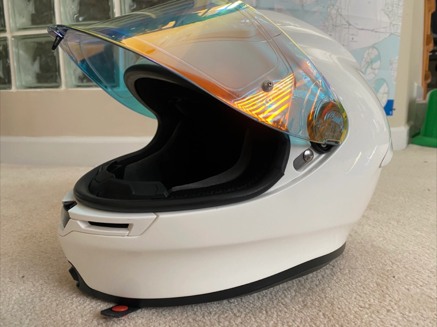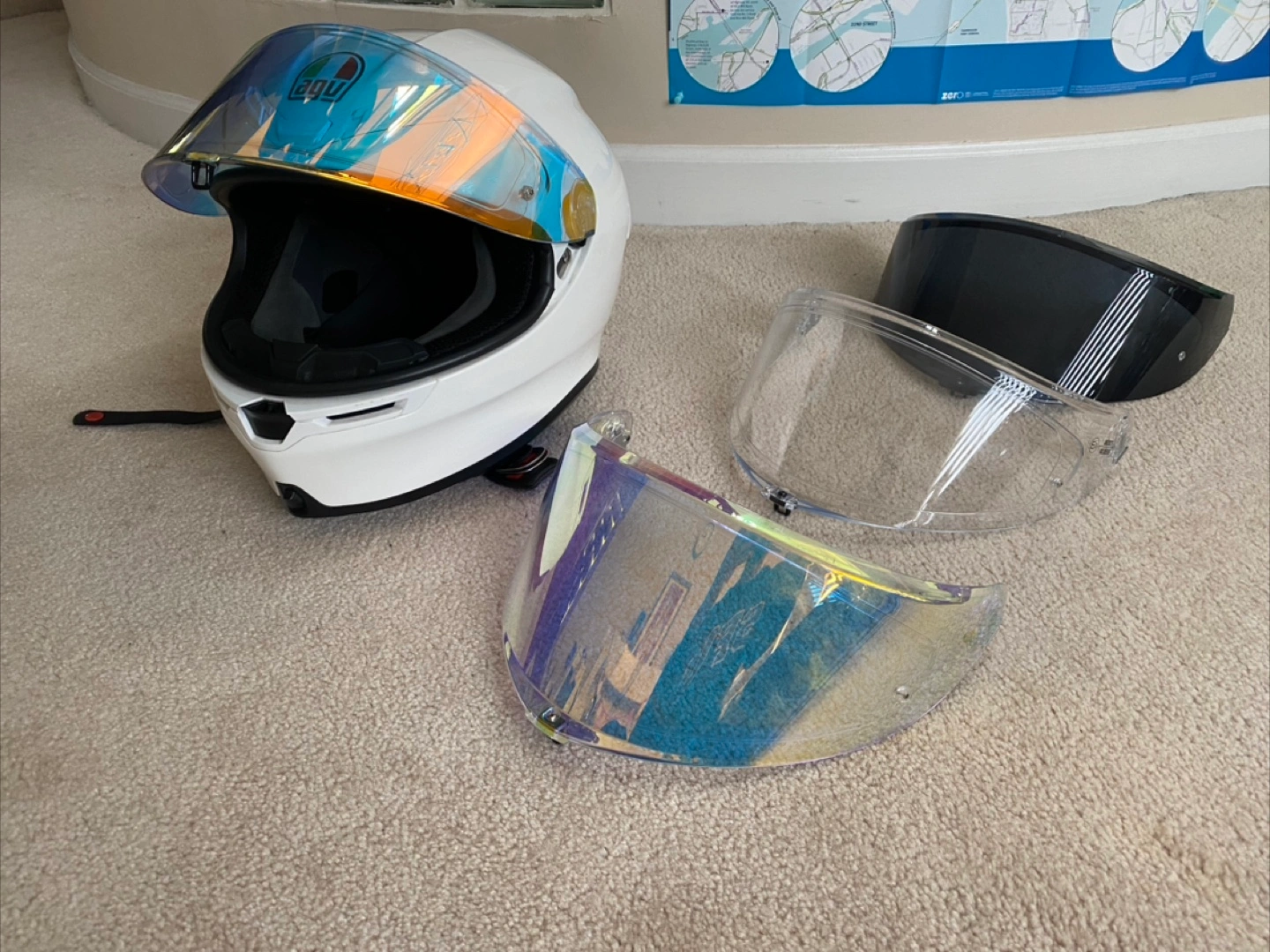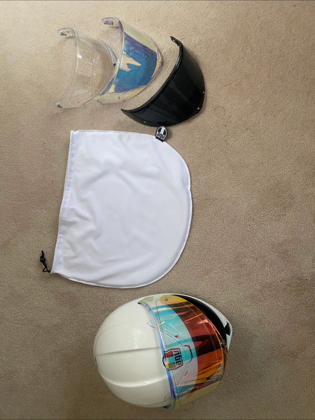 Large Agv K6s, includes iridescent, dark, clear oem visor. photochromic (with its own pinlock) one mounted on helmet right now. oem clear and iridescent visor both have oem pinlocks installed. Jan 2023 mfg date.