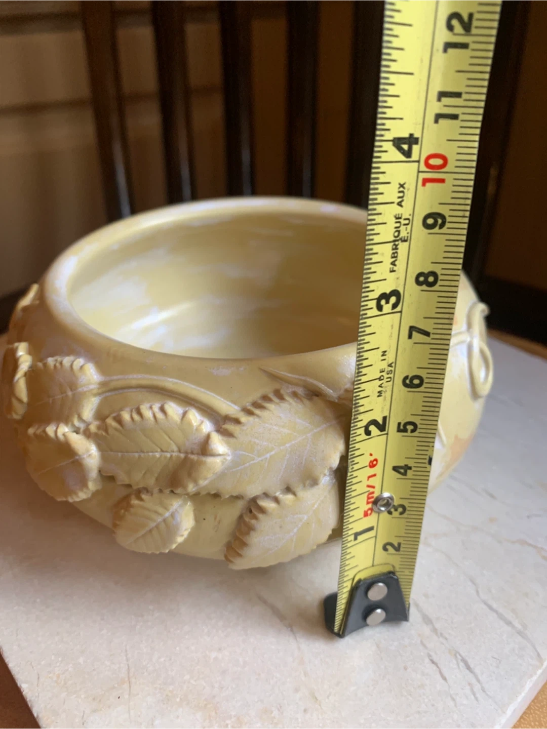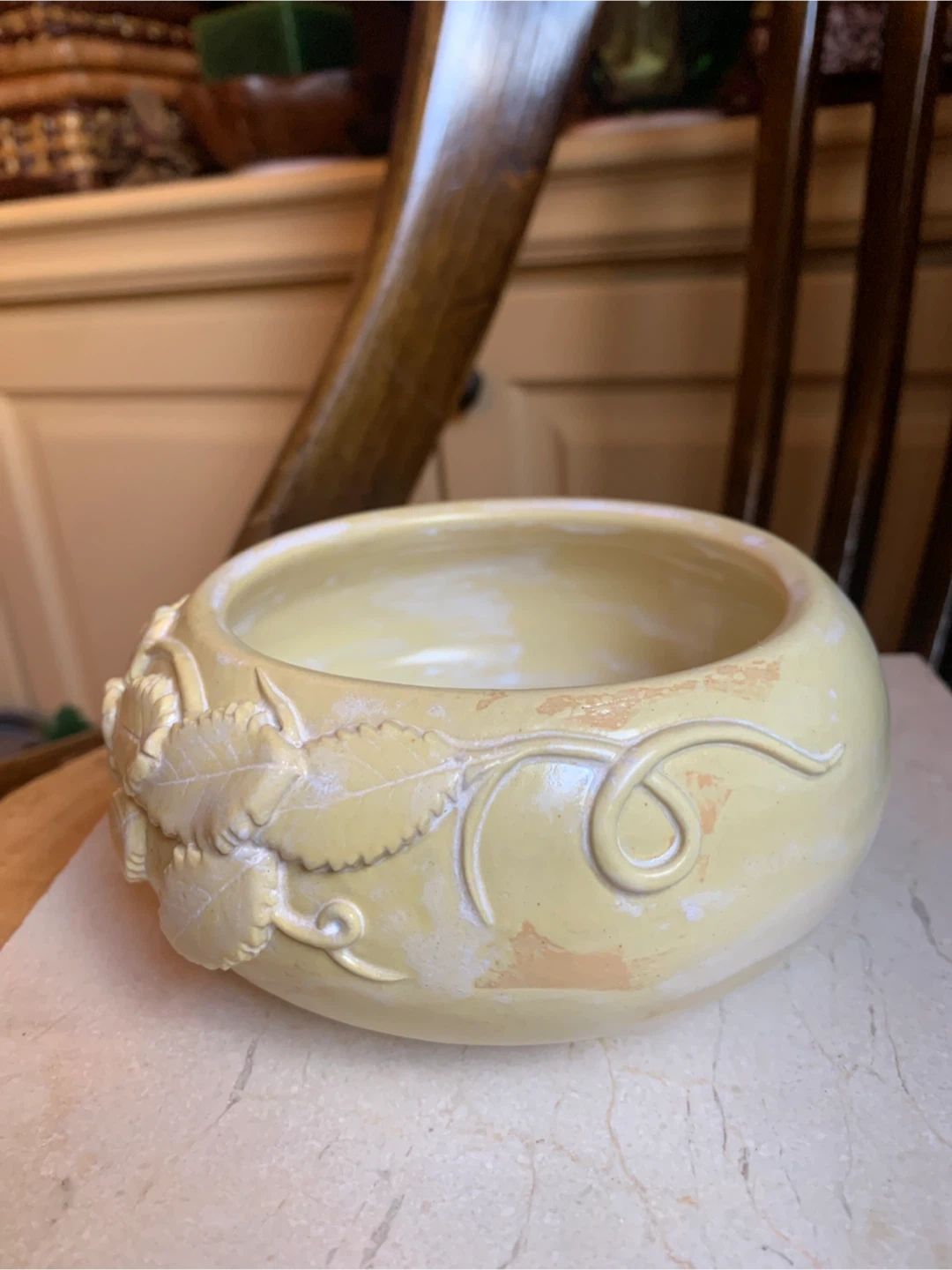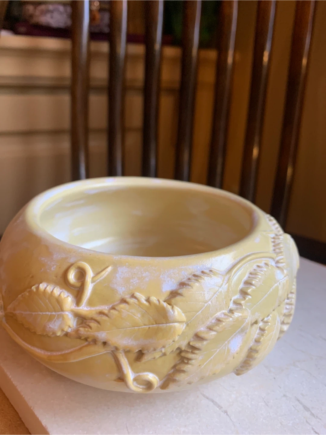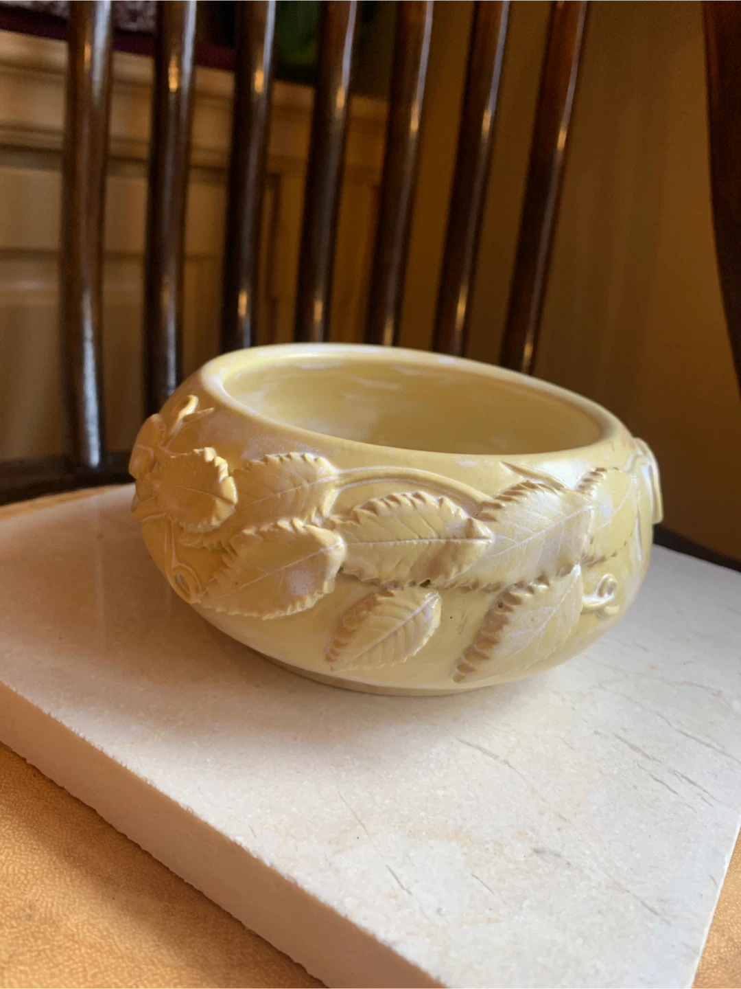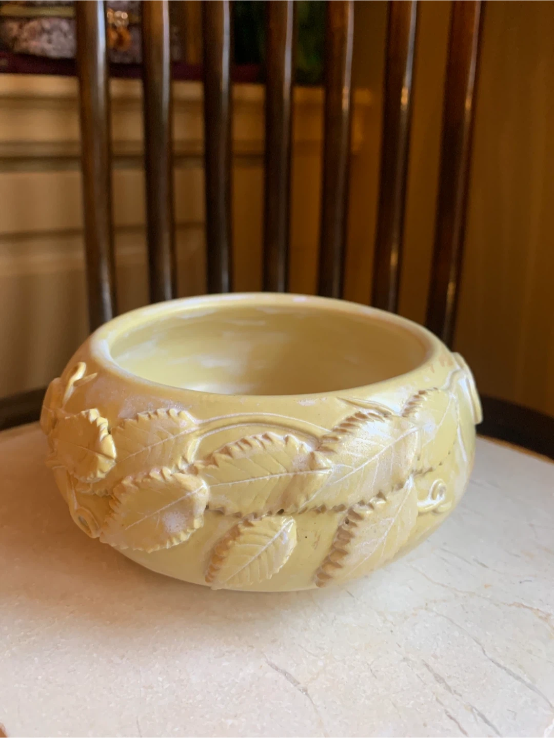 A handcrafted ceramic bowl featuring embossed leaf designs. It's a unique decorative piece in a soft yellow tone. Measures approximately 4.5 inches in diameter and just under 3” in height. There are no chips or cracks. It would make a beautiful catch all for keys, jewelry, shelf sitter or for a succulent plant.