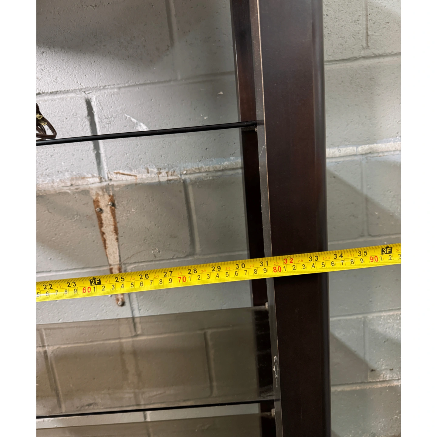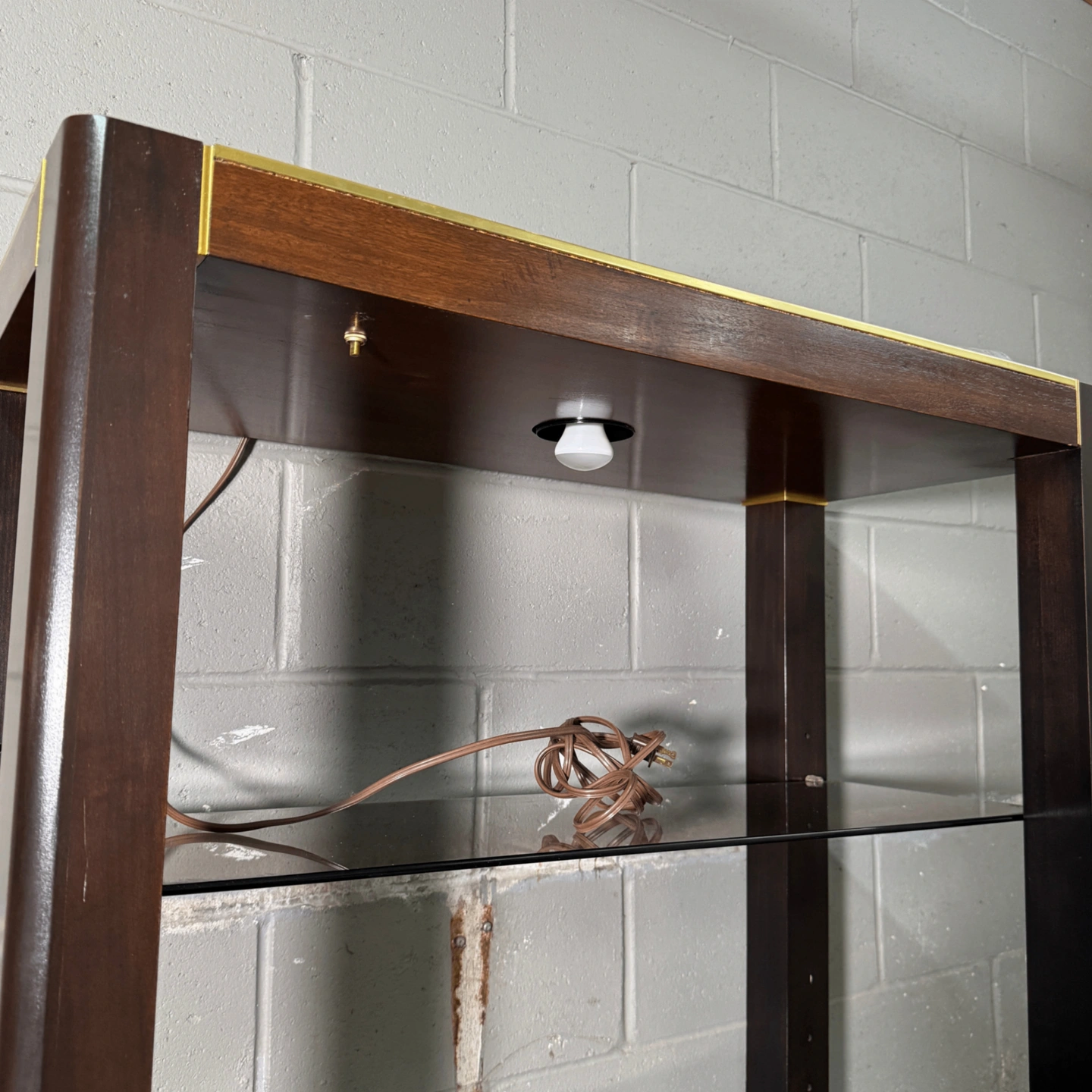 Selling a display shelf with a dark brown wood frame and glass shelves. It has a light at the top. It measures approximately 76 inches tall and 34 inches wide.