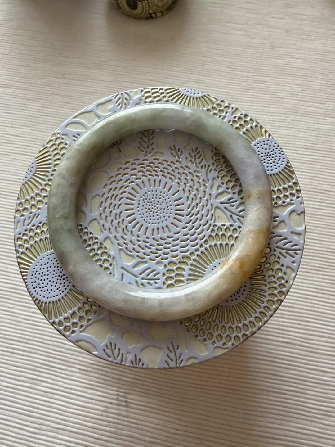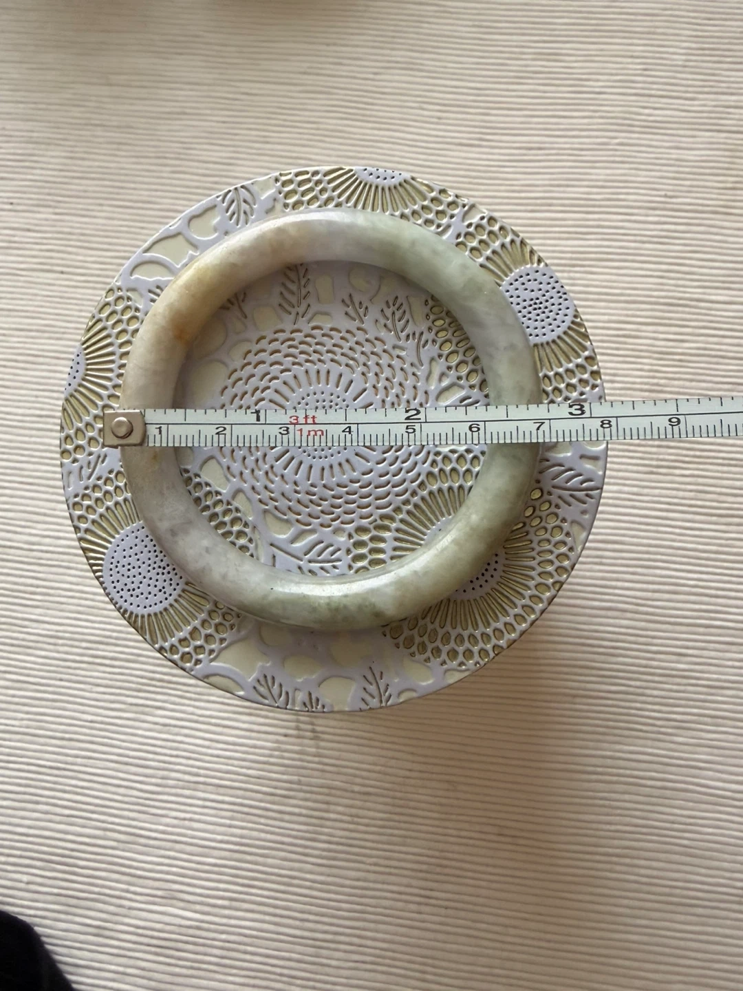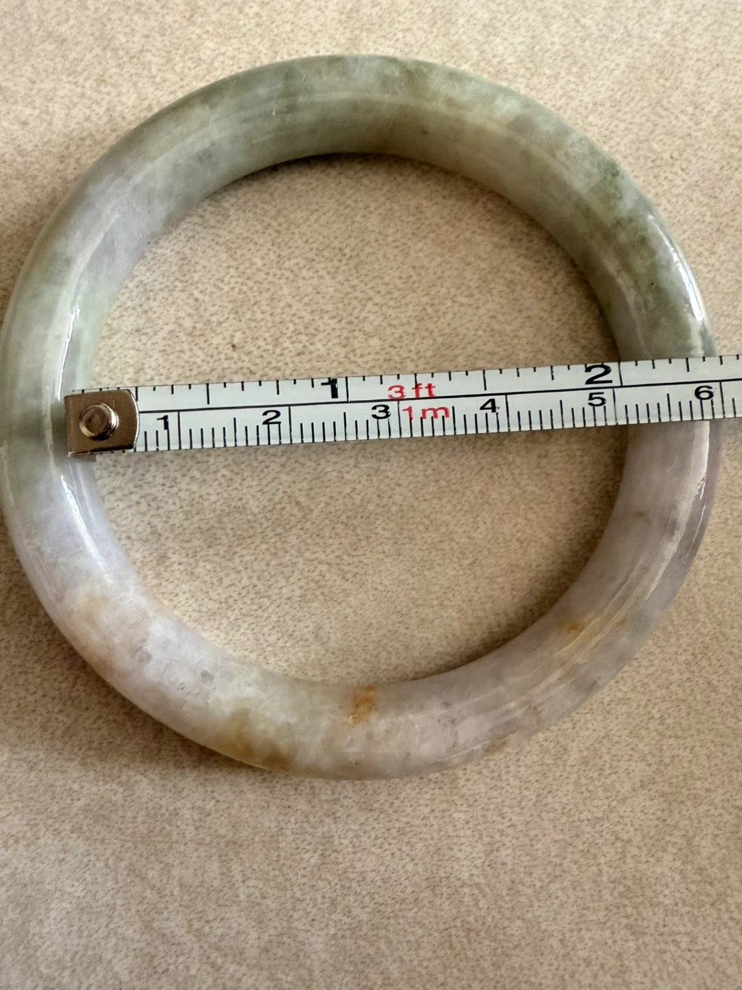 This is a beautiful jade bangle bracelet with a marbled green and beige colouration. It measures approximately 2.5 inches in diameter. A classic accessory that complements any outfit!