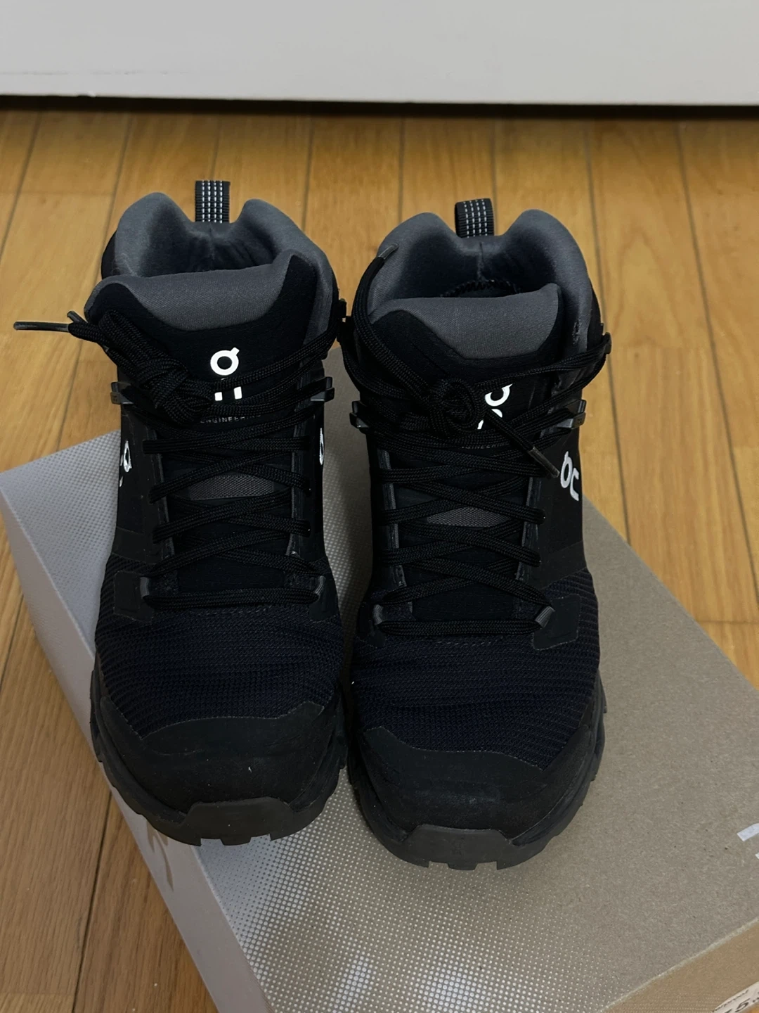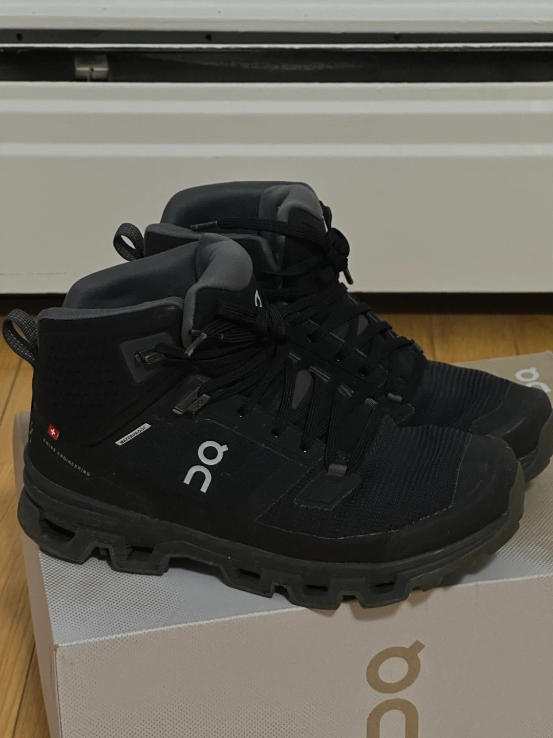 These On Cloudrock 2 Waterproof hiking boots are black with an eclipse colourway. They're designed for waterproof performance and rugged terrain. The women's size is 7.5 US. These boots are built for your next outdoor adventure!