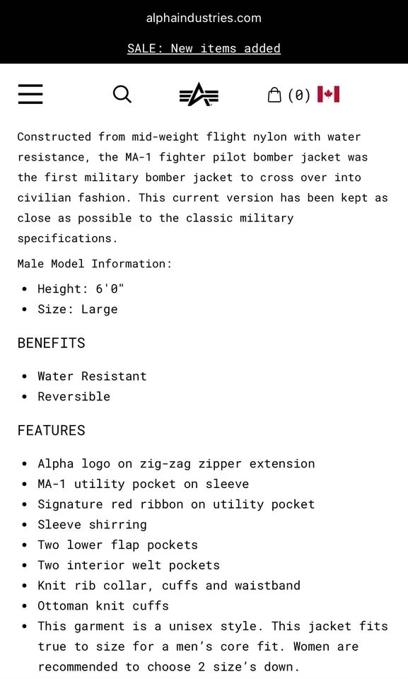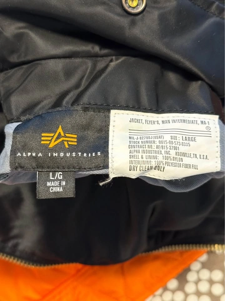 Original Alpha Industries MA-1 Bomber Jacket in men's size L (regular fit). Only worn a few times and in very good condition with no rips or stains. Dry cleaned after last use. Pick up in Langley or meet up in Vancouver.