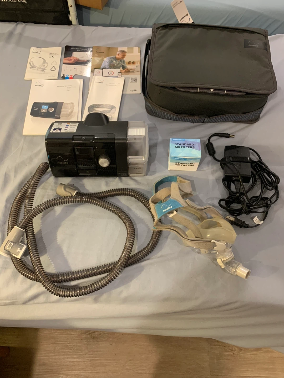 This ResMed AirSense 10 CPAP machine comes with a mask, tubing, travel bag, and extra standard air filters. It's a complete sleep apnea therapy setup. Includes power adapter and manuals.