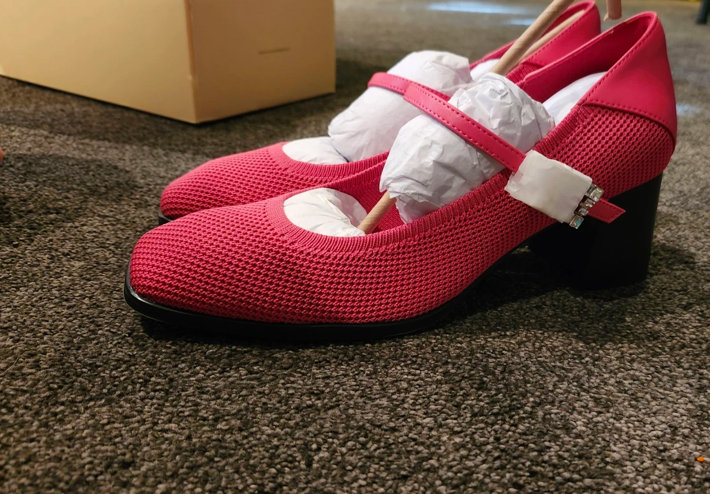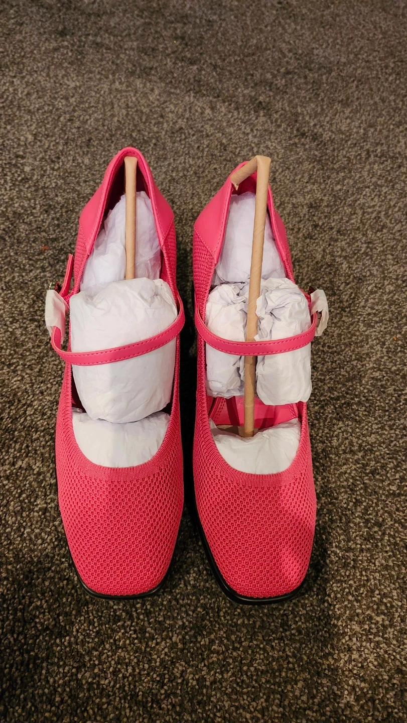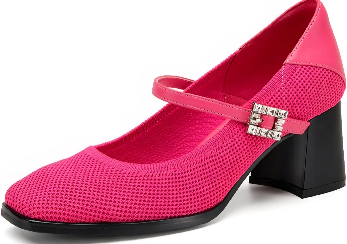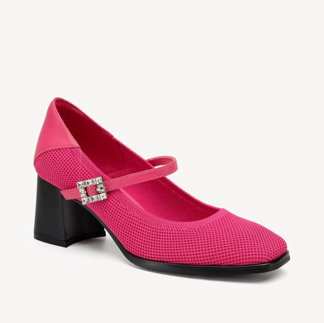 These stylish pink Mary Jane heels feature a comfortable knit upper and a chic square toe. They have an adjustable strap with a dazzling rhinestone buckle. The block heel adds a touch of elegance, perfect for dressing up or down!