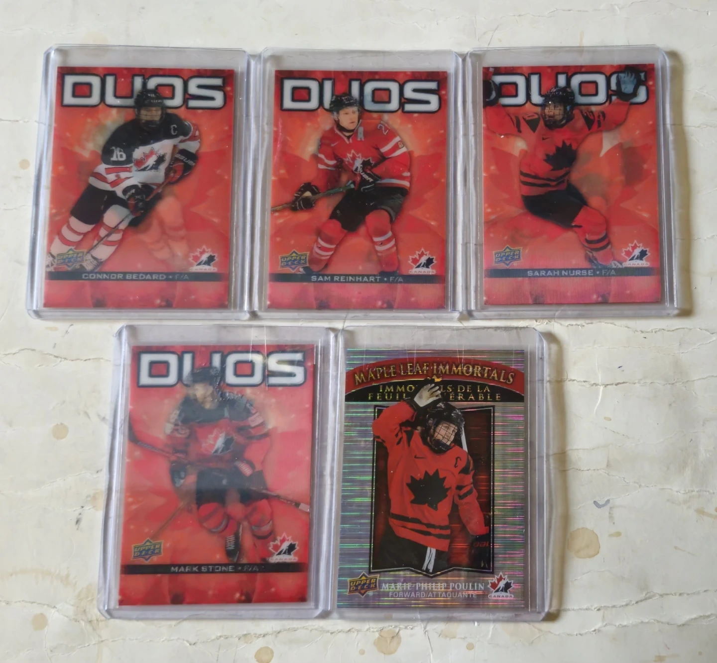 This is a lot of 5 Tim Hortons hockey trading cards. It includes cards featuring Connor Bedard, Sam Reinhart, Sarah Nurse, Mark Stone, and Marie-Philip Poulin. These cards are from the 2025-2026 Tim Hortons Collection Series.