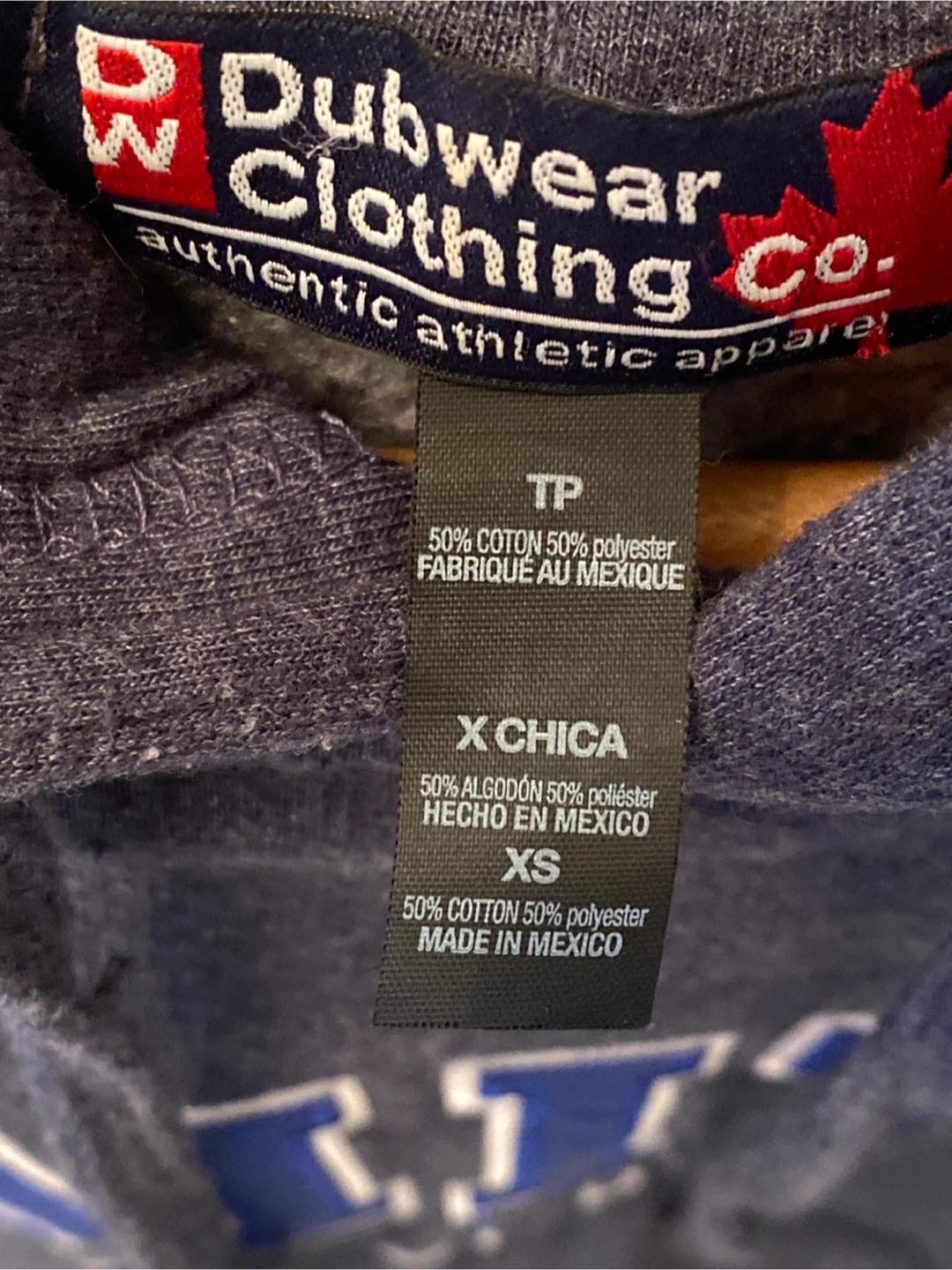 Navy blue hoodie from Dubwear Clothing Co. that says Smith School of Business. It's made of 50% cotton and 50% polyester. Made in Mexico.