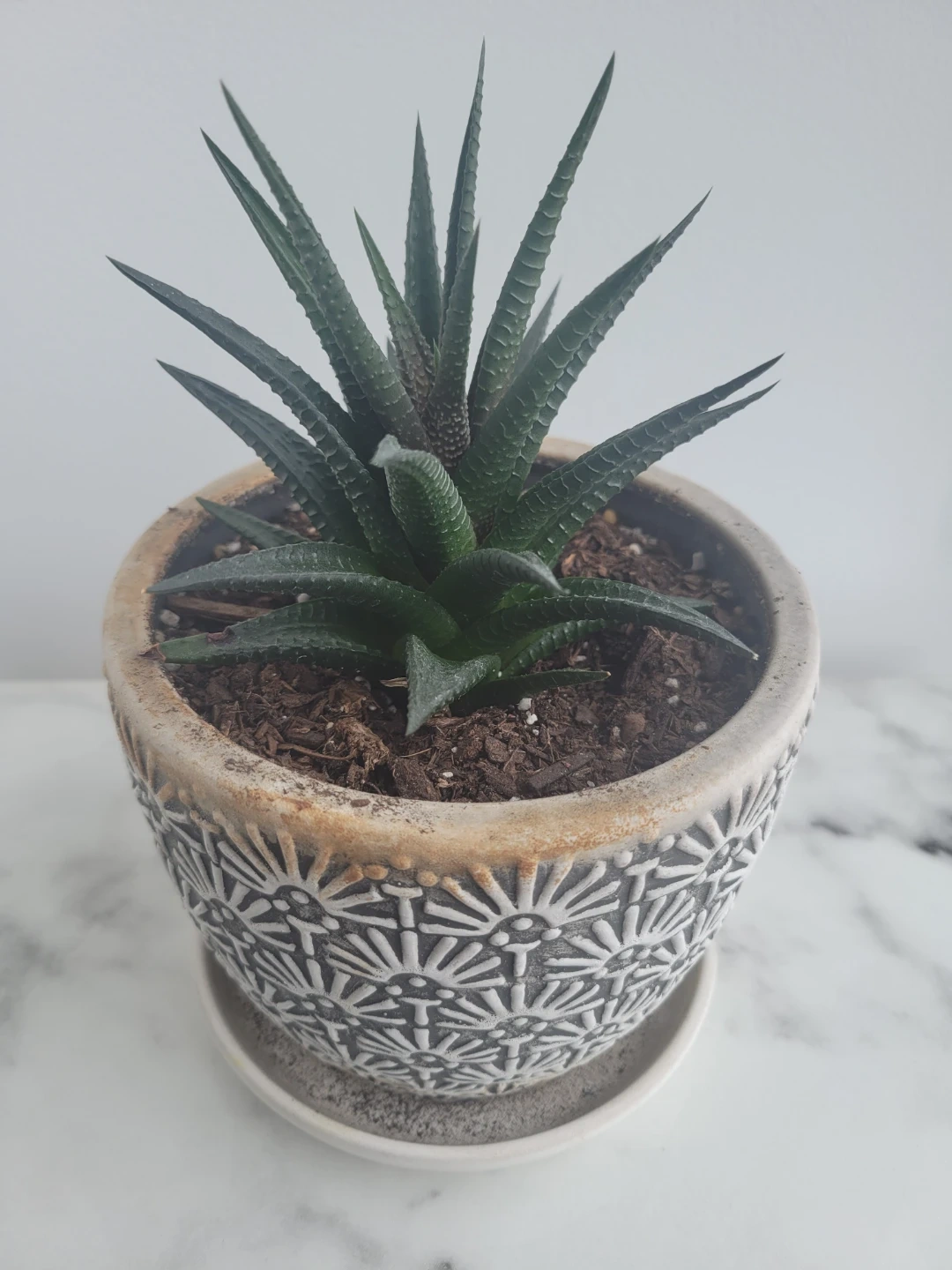 This Haworthia plant comes in a stylish decorative pot with a matching saucer. It's a low-maintenance succulent that thrives in bright, indirect light. A great addition to any indoor space!