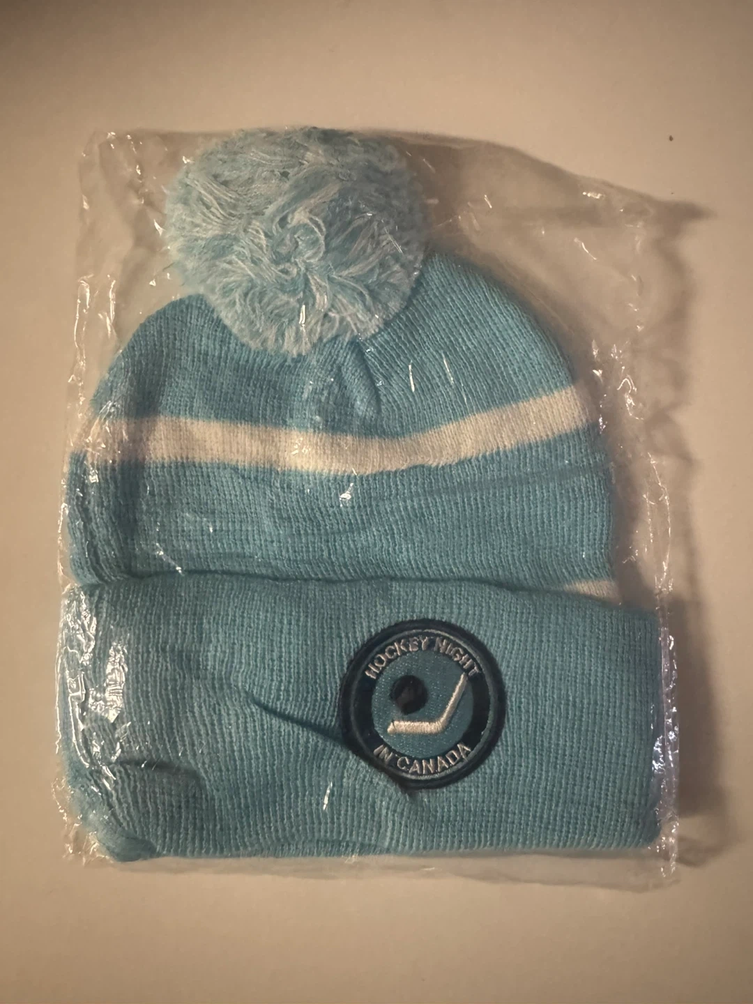 Light blue knit toque with white stripes and a pompom. Features a "Hockey Night in Canada" patch on one side and a Budweiser "Proud Partner" logo on the other. This toque is great for staying warm while cheering on your favourite hockey team!