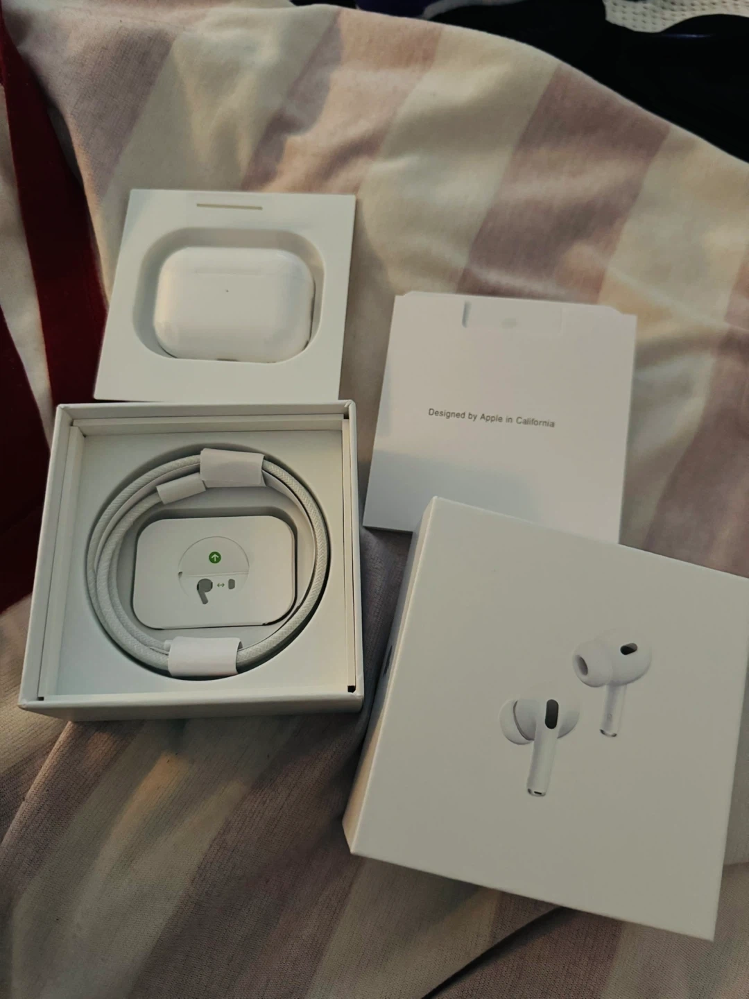 Apple AirPods Pro (2nd generation) in original packaging. Includes AirPods Pro, charging case, and USB-C charging cable. Designed in California.