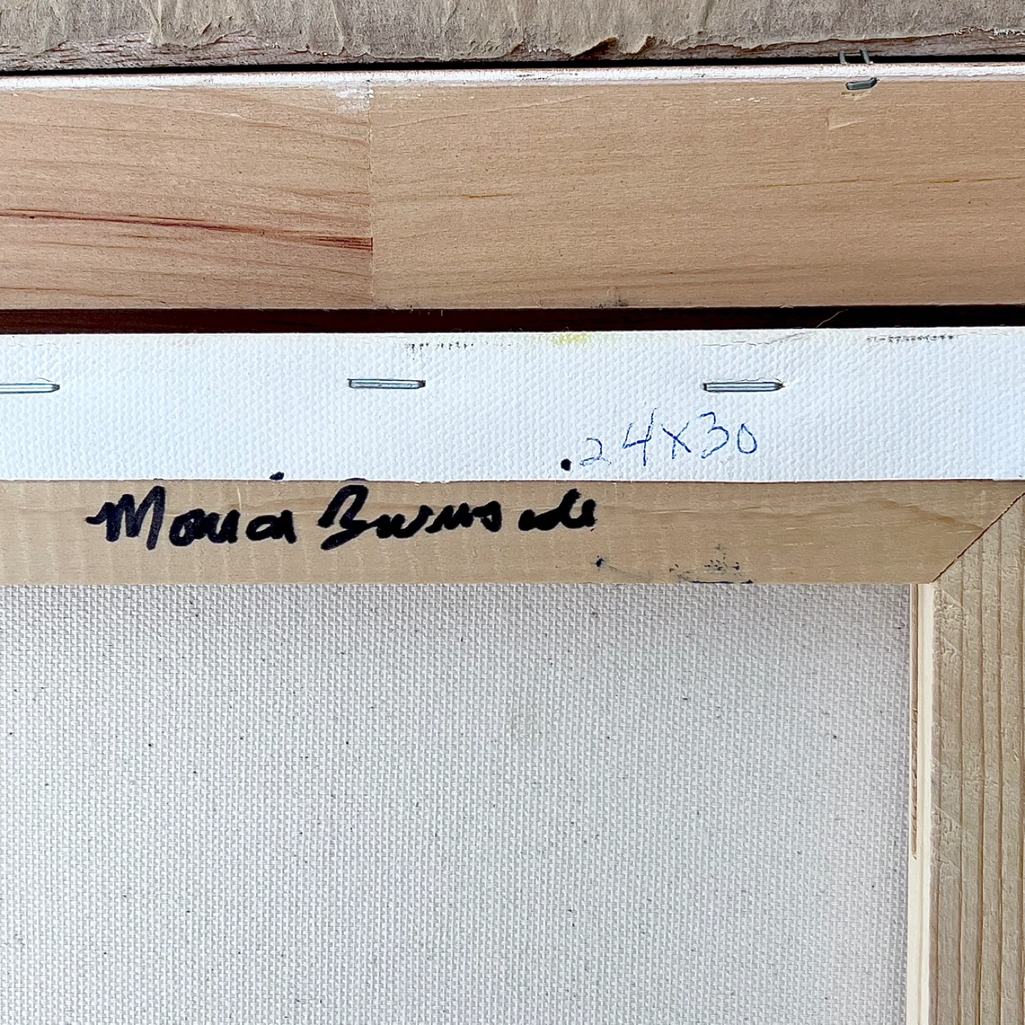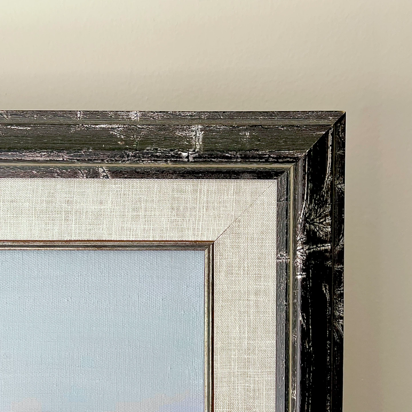 Striking large painting on canvas of boats docked at a marina, set in black frame with silver accenting. The painting itself is 24”w x30”h and the frame measures 30”w x36”h. No damage