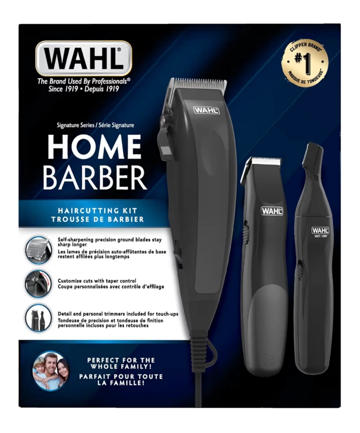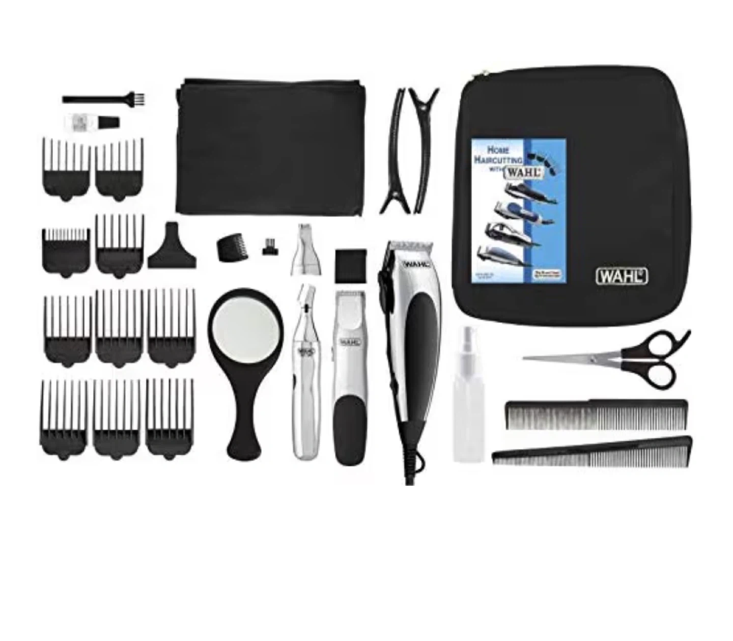 This Wahl Home Barber kit includes a full-size clipper, detail trimmer, and personal trimmer. It comes with numerous guide combs, scissors, a comb, mirror, cleaning brush, and a carrying case for convenience. Self-sharpening blades ensure precision cutting.