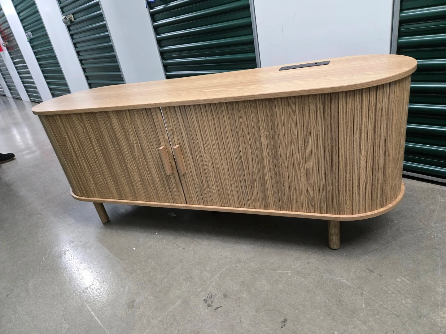 **Closing Sale** Selling a light wood media console in great condition! It features a unique design with sliding doors and a built-in power outlet on top. Perfect for organizing your entertainment setup and adding a touch of style to your living room