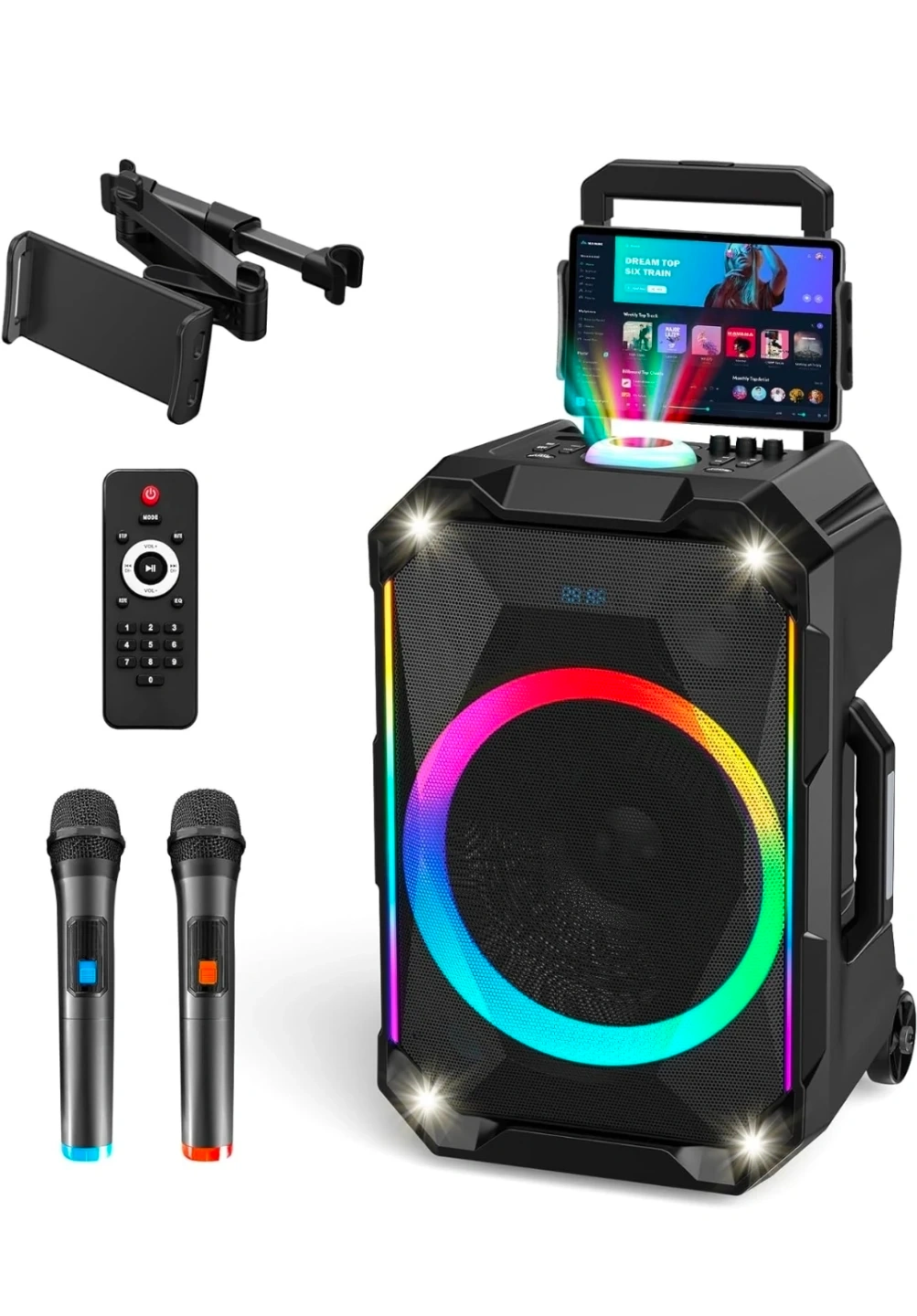 This portable PA speaker system comes with two microphones and a remote control. It features colorful LED lighting and a built-in tablet holder. Great for parties or karaoke!
