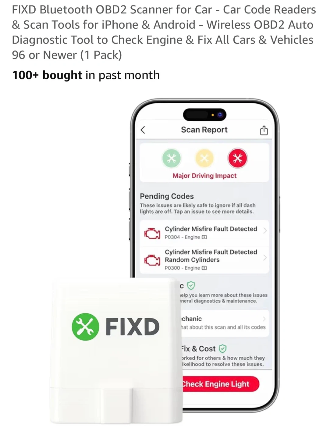 This FIXD device connects wirelessly to your car to help diagnose check engine lights and other issues. It's compatible with both iPhone and Android devices. This tool helps simplify car care by providing diagnostic information.