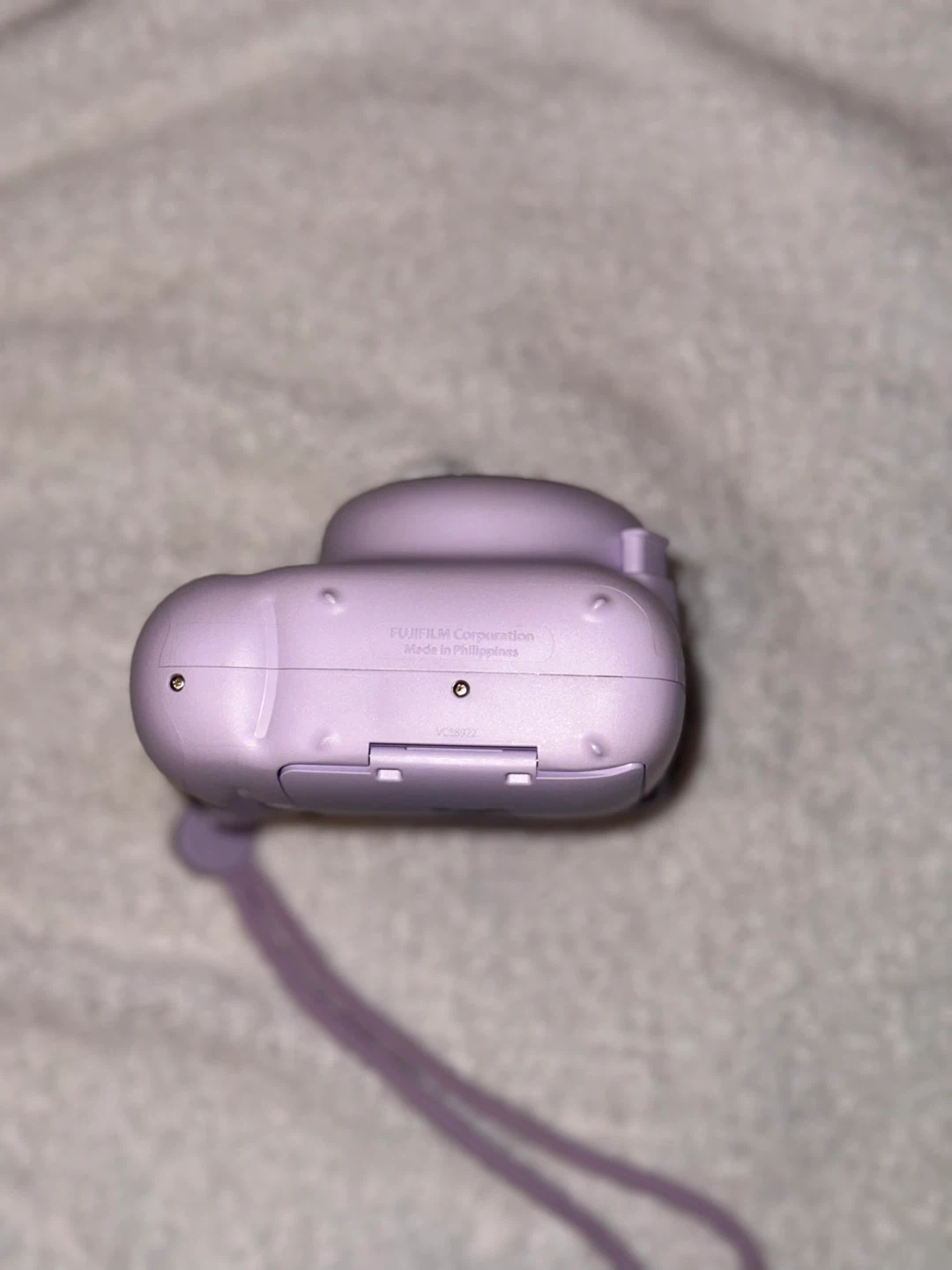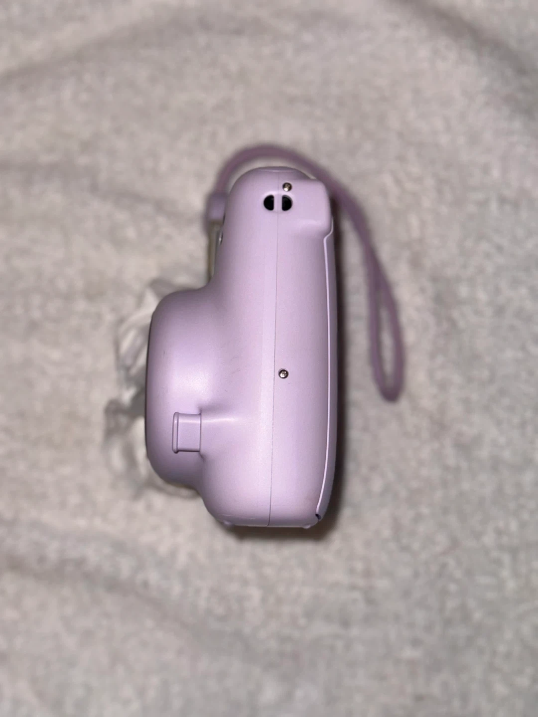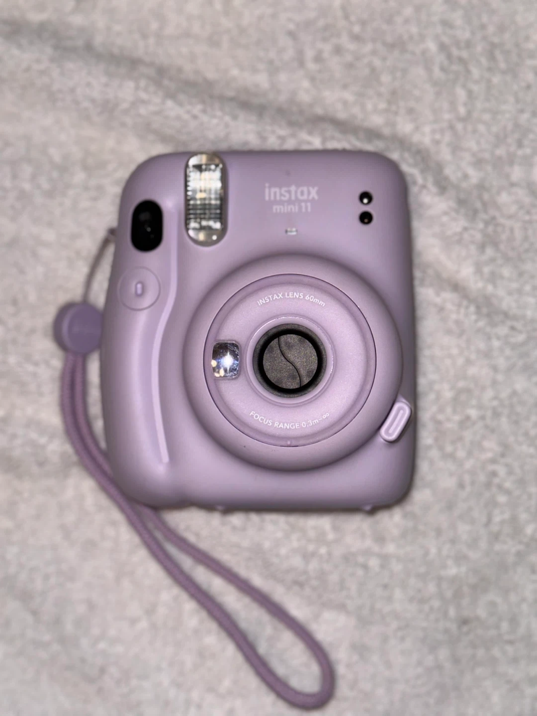 Fujifilm Instax Mini 11 instant camera in lilac purple. It's a compact and easy-to-use camera for instant prints. It features a built-in lens for close-ups and selfies. This camera is great for capturing memories on the go!