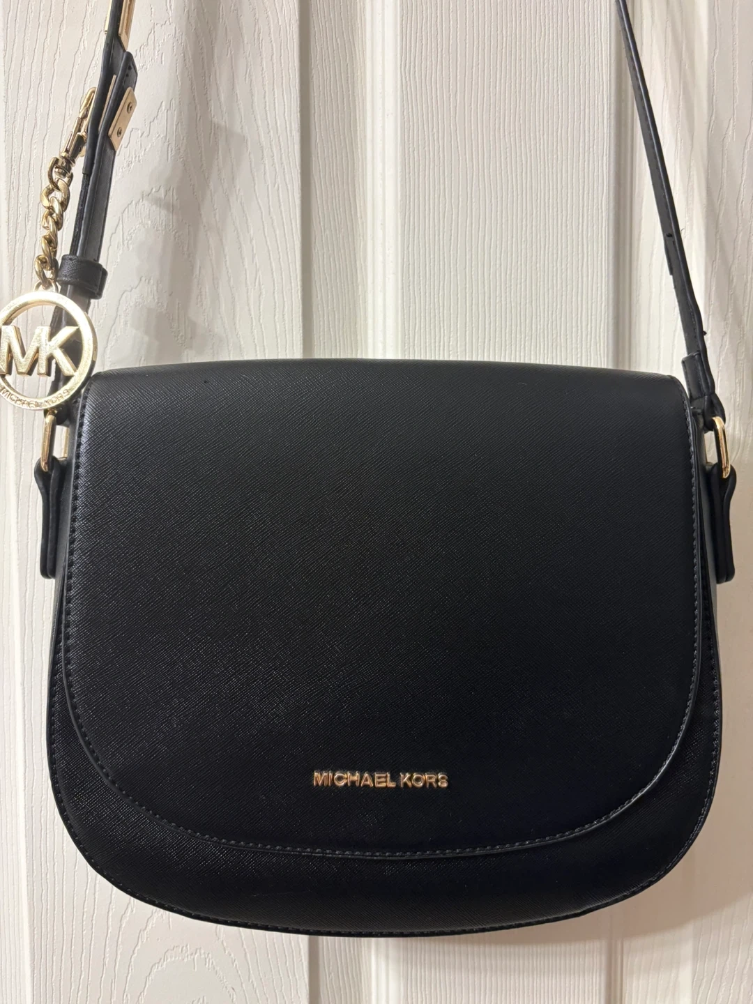 Chic black shoulder bag by Michael Kors. Features elegant gold accents. Adjustable strap, you can adjust the strap and secure the length with a beautiful MK charm, so original! The condition of the bag is “like new”, the strap has minimal signs of wear, almost unnoticeable. Saffiano leather material. Perfect for everyday style. Pick up in Chestermere.