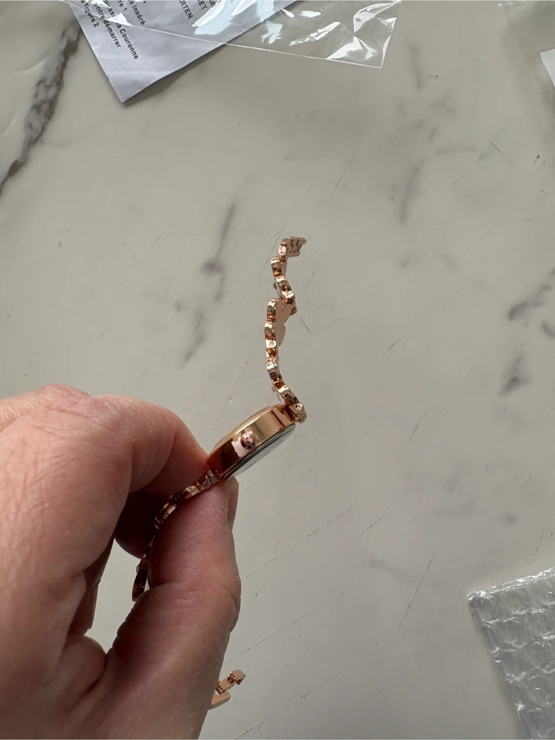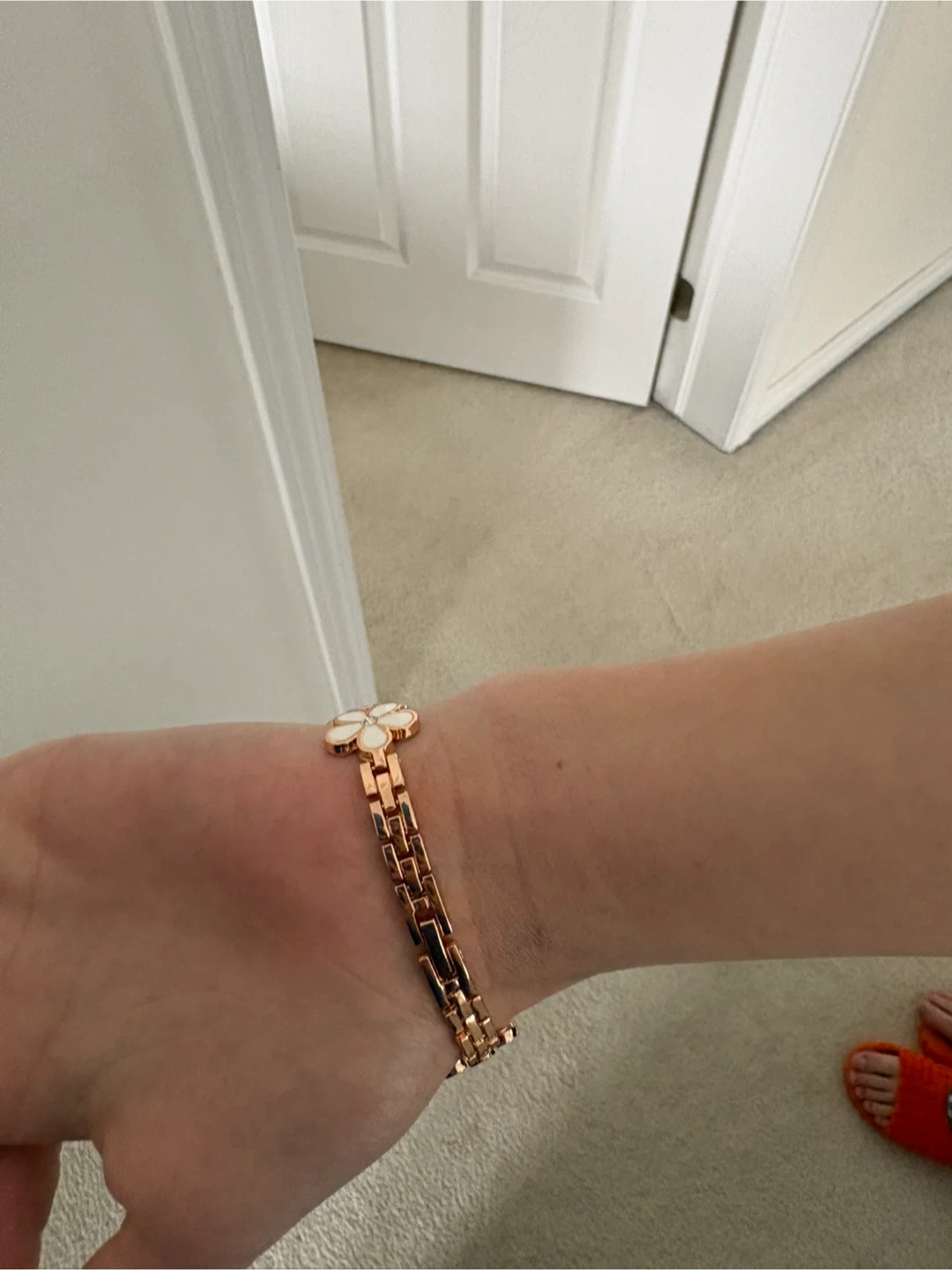 Elegant rose gold women’s watch with floral bracelet details. Slim and stylish design, perfect for everyday wear or special occasions. The bracelet features flower-shaped links with small stone accents.