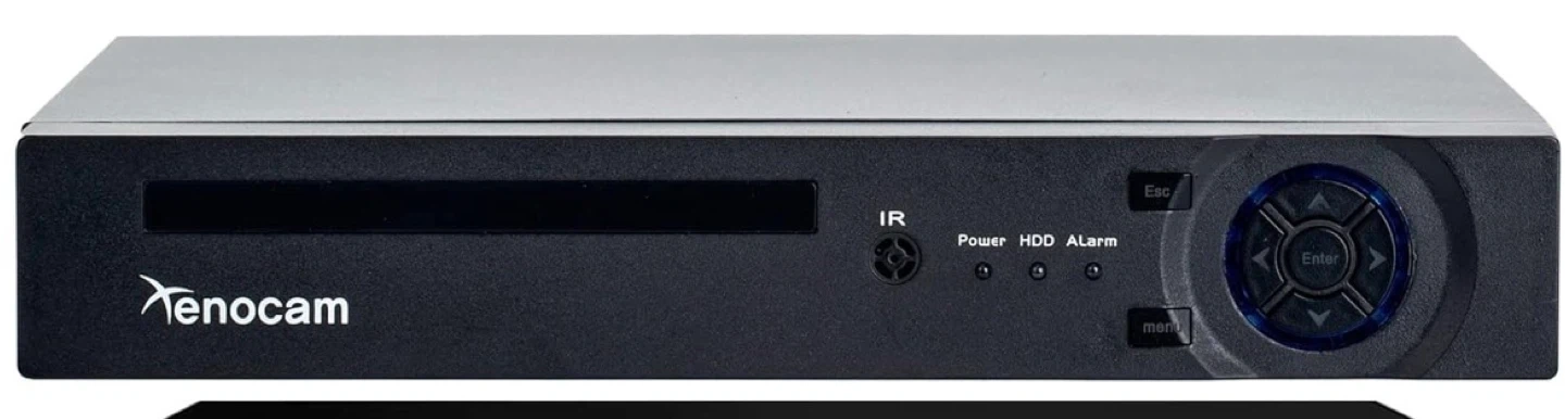 This Xenocam DVR security system supports 4 or 8 channels. It includes multiple video input and output options, including VGA and HD-OUT. USB and LAN ports are available for connectivity. Power is supplied via DC 12V.
