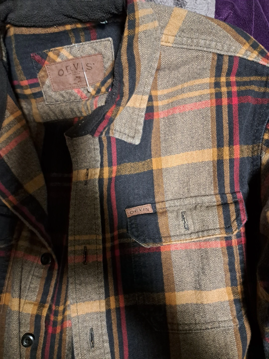 Orvis plaid flannel shirt with button-up front. It's a classic casual shirt for cooler weather. Perfect for layering.