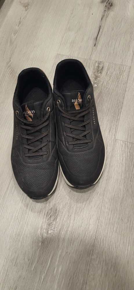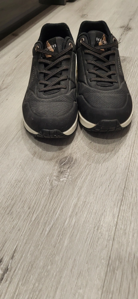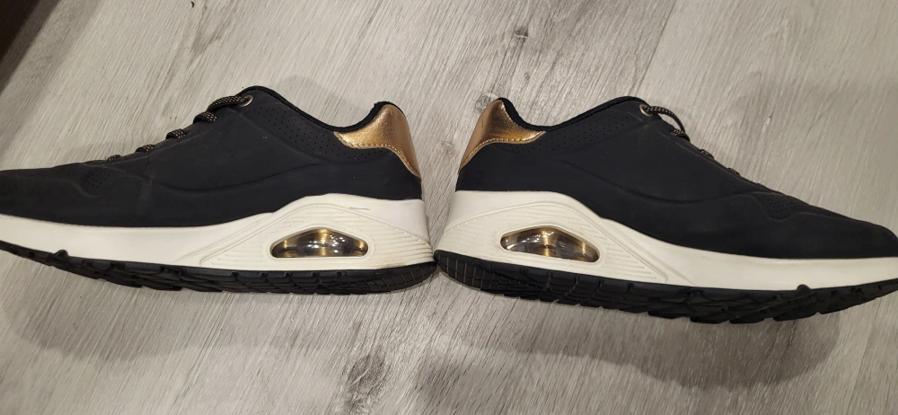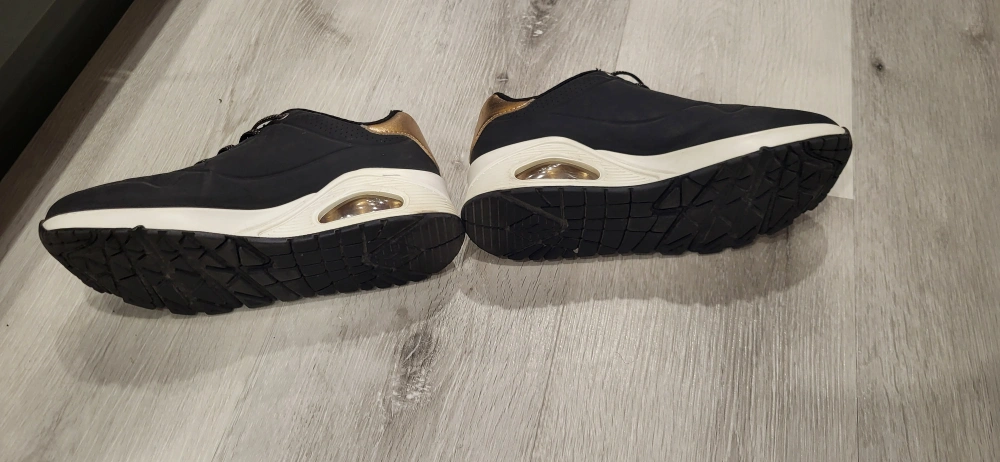 Black sneakers with rose gold accents. Lace-up closure. Chunky white sole. Good condition.