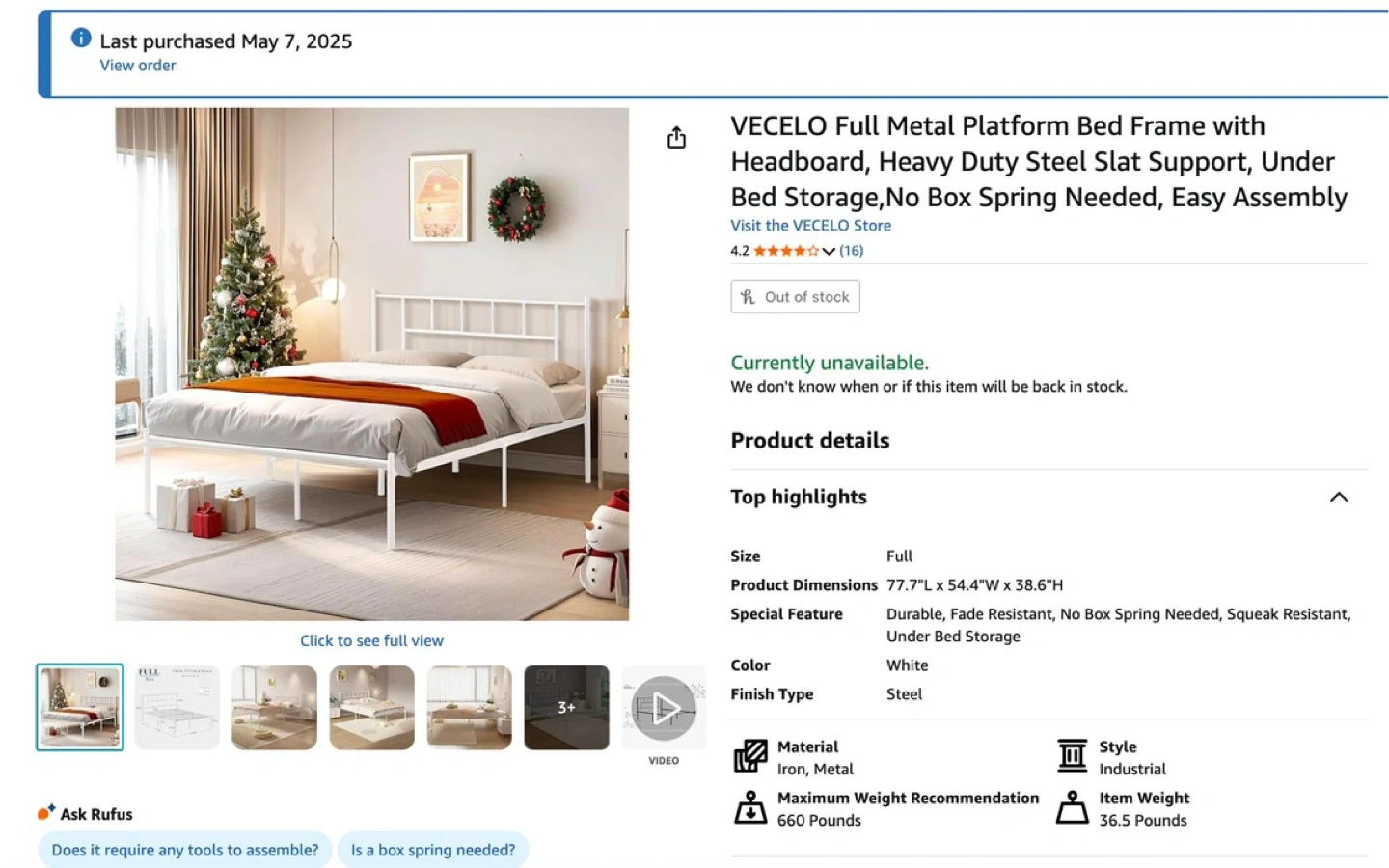 Selling a Full Metal Platform Bed Frame in white! It features a headboard, and heavy-duty steel slat support. No box spring is needed, and it's easy to assemble. The product dimensions are 77.7"L x 54.4"W x 38.6"H. It's durable, fade-resistant, squeak-resistant, and has under-bed storage. The material is iron and metal, and the style is industrial.