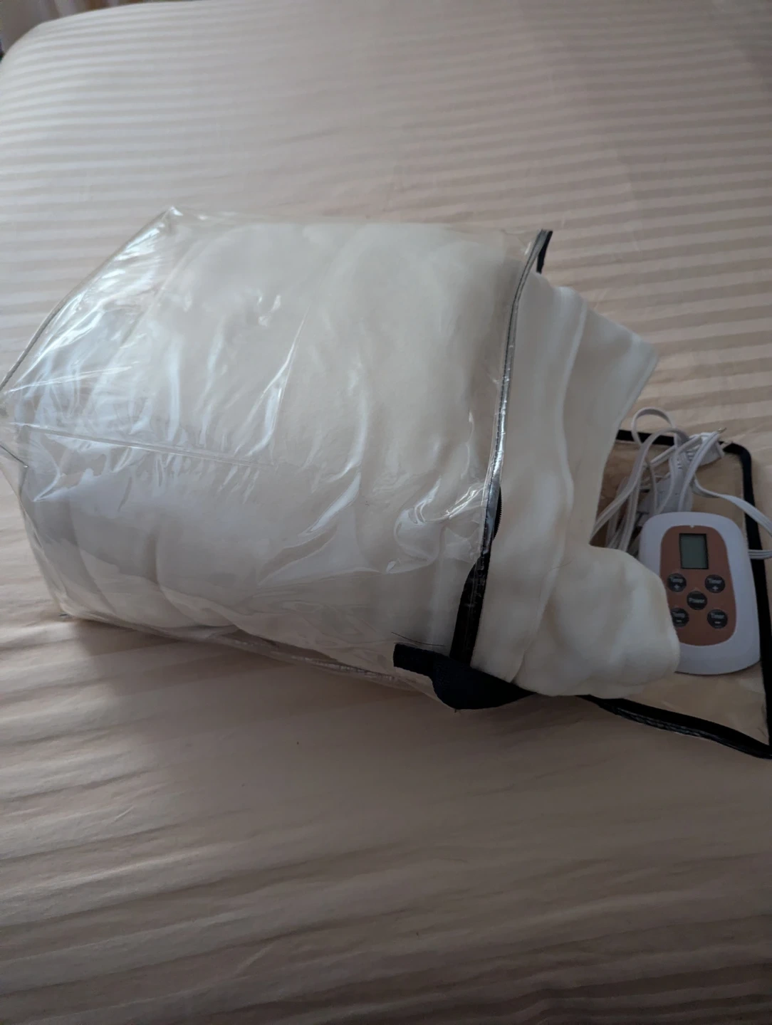 Here's an electric heated blanket, still in its original packaging! It comes with a controller to adjust the heat settings for those chilly nights. Perfect for staying cozy during the colder months!