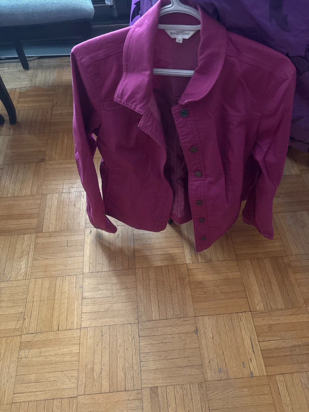This is a women's pink jacket from Reflections. It features a collared neckline and button-up front. The jacket is made of a soft fabric. It's a stylish layering piece for any outfit!