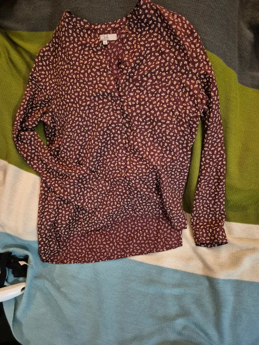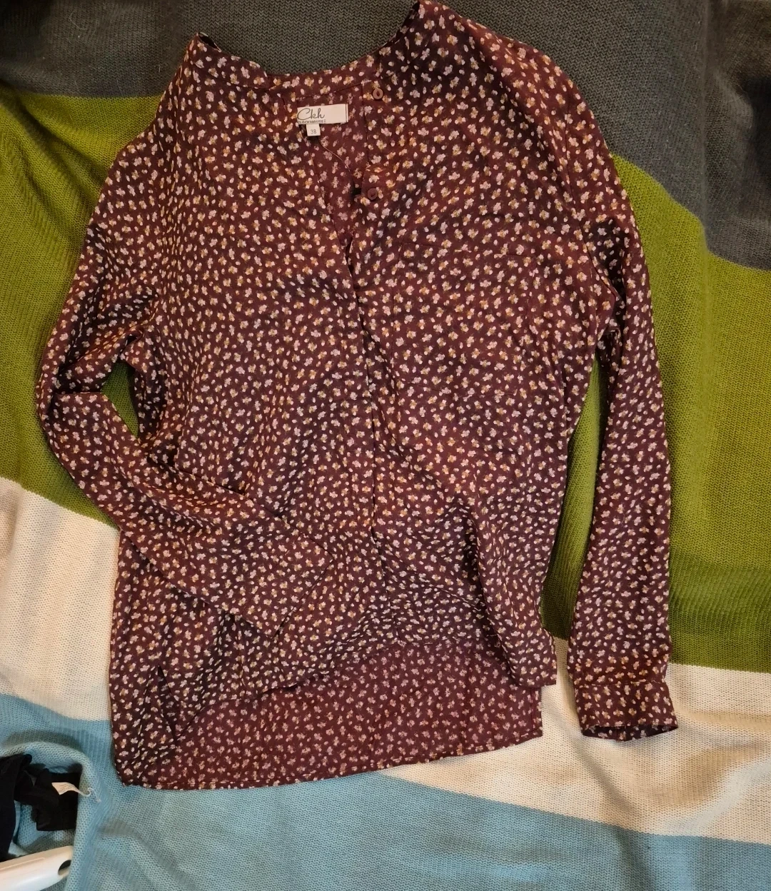 A lovely floral print blouse from Clockhouse. It features a button-up front and a collared neckline. The bottom of the shirt is longer in the back!